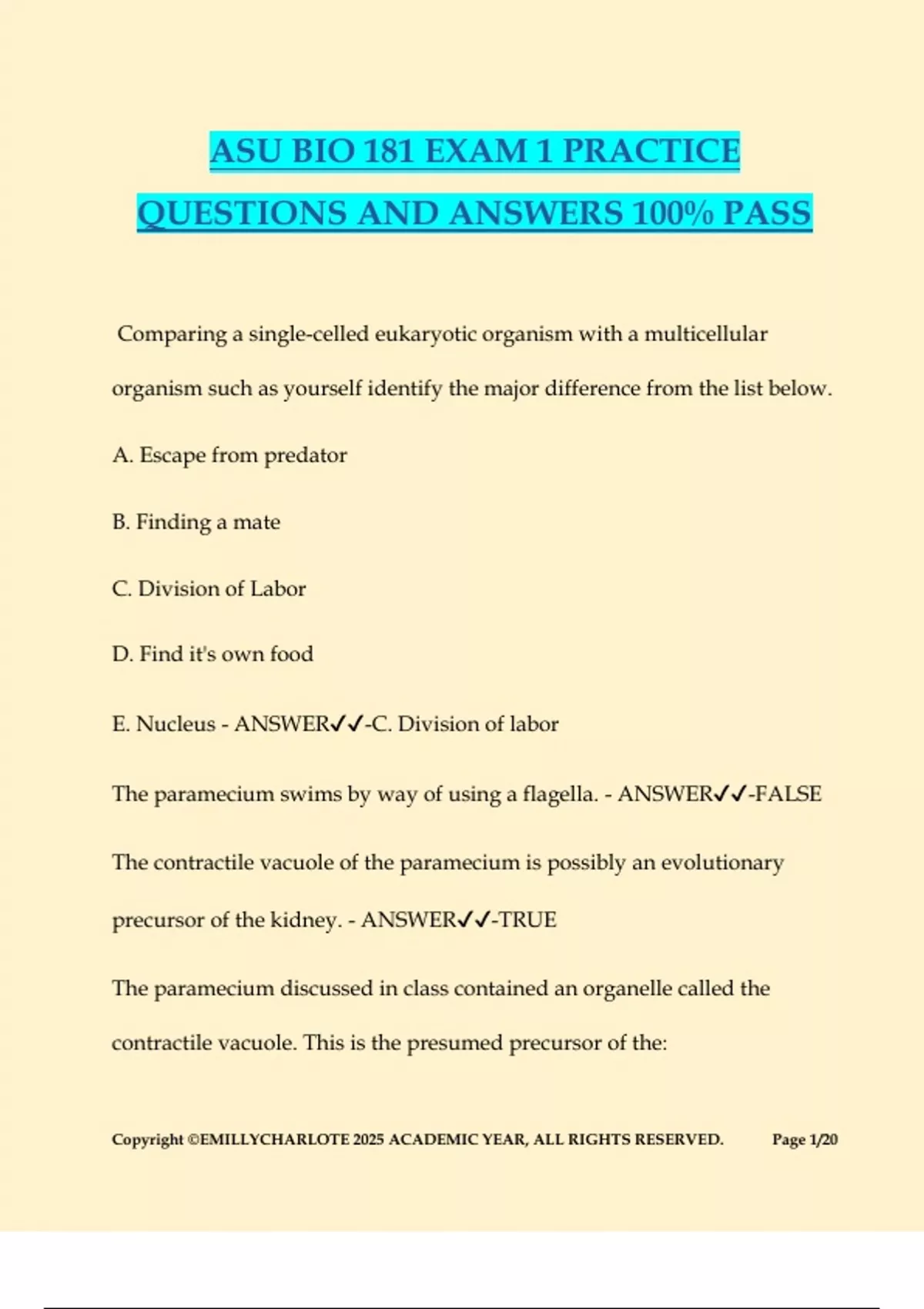ASU BIO 181 EXAM 1 PRACTICE QUESTIONS AND ANSWERS 100% PASS Comparing a single-celled eukaryotic organism with a multicellular organism such as yourself identify the major difference from the list below. A. Escape from predator B. Finding a mate C. Division of Labor D. Find it's own food E. Nucleus - ANSWER-C. Division of labor The paramecium swims by way of using a flagella. - ANSWER-FALSE The contractile vacuole of the paramecium is possibly an evolutionary precursor of the kidney. - ANSWER-TRUE The paramecium discussed in class contained an organelle called the contractile vacuole. This is the presumed precursor of the: Copyright ©EMILLYCHARLOTE 2025 ACADEMIC YEAR, ALL RIGHTS RESERVED. Page 2/20 A. Heart B. Kidney C. Liver D. Mouth E. Answer is not listed - ANSWER-B. Kidney In your own multicellular body, cells with different functions have different DNA. - ANSWER-FALSE A single-celled eukaryotic organism: A. Has a limited number of biomolecular machines. B. Must find food, shelter, a mate and reproduce C. Escape from predators D. None of the above E. Answers A,B,C - ANSWER-E. Answers A,B,C A cell that is anchorage-dependent for growth will also exhibit contact inhibition. - ANSWER-TRUE Copyright ©EMILLYCHARLOTE 2025 ACADEMIC YEAR, ALL RIGHTS RESERVED. Page 3/20 In your own multicellular body, different cells in your body have a division of labor between them. - ANSWER-TRUE Compared to bacteria which of the cell types below are not responsible for finding food" A. Lymphocyte B. Macrophage C. Fibroblast D. None of the above E. Answers a, b, and c - ANSWER-E. Answers A, B, C What limits the paramecium from acquiring more complex functions? - ANSWER-Limited number of biomolecular machines A normal cell is anchorage-dependent for growth and mortal. - ANSWER-TRUE In order to examine cells which are smaller than can be detected by the human senses what needs to be used? (pick the best answer). A. Patience Copyright ©EMILLYCHARLOTE 2025 ACADEMIC YEAR, ALL RIGHTS RESERVED. Page 4/20 B. Hypotheses C. Technology D. A cell trap E. None of the above - ANSWER-C. Technology In Cell Biology what can limit the progress of science? A. Lymphocyte B. Progress C. Eating D. Bacteria E. Technology - ANSWER-E. Technology A cancer cell will be anchorage-depende
