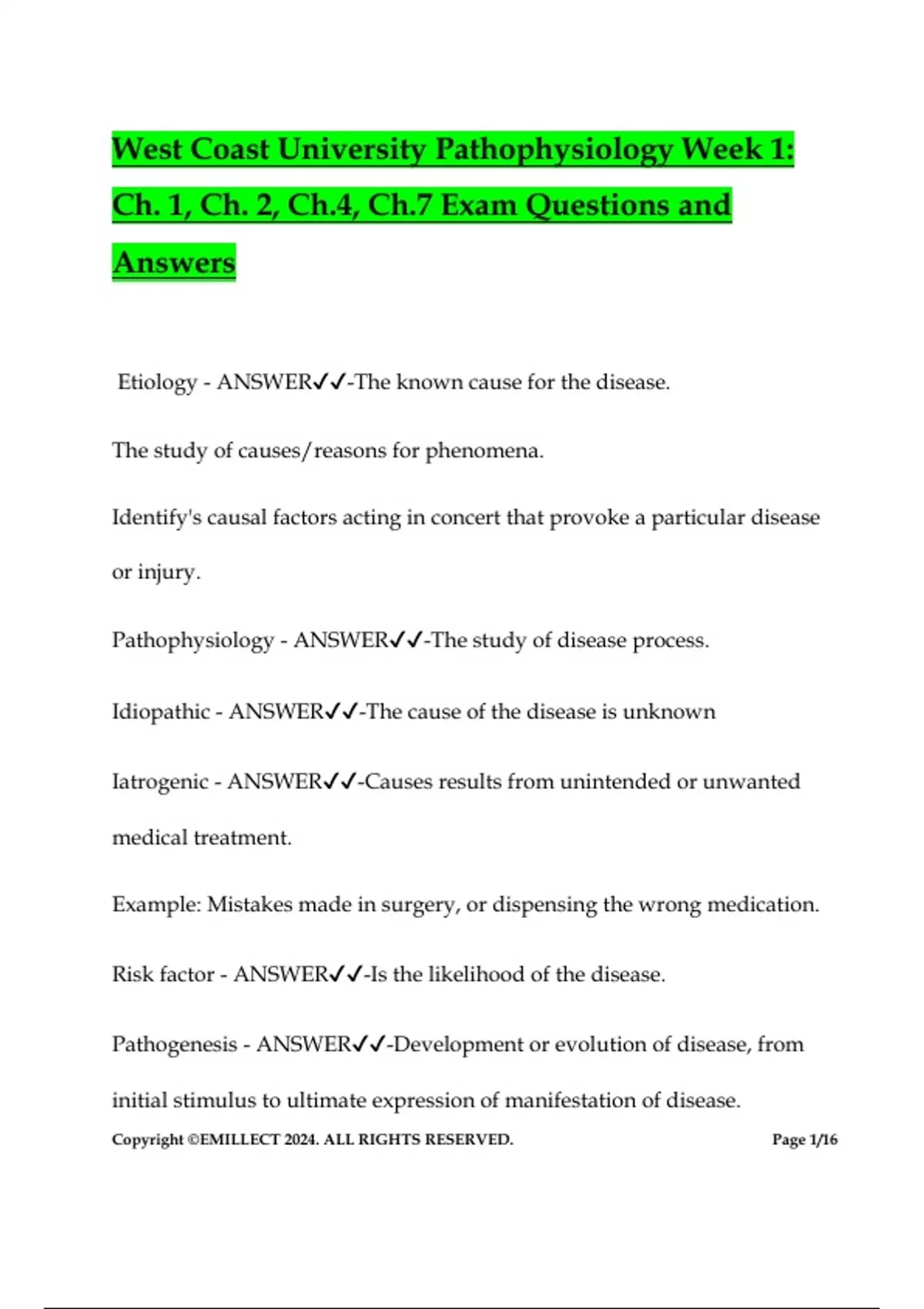 West Coast University Pathophysiology Week 1: Ch. 1, Ch. 2, Ch.4, Ch.7 Exam Questions and Answers Etiology - ANSWER-The known cause for the disease. The study of causes/reasons for phenomena. Identify's causal factors acting in concert that provoke a particular disease or injury. Pathophysiology - ANSWER-The study of disease process. Idiopathic - ANSWER-The cause of the disease is unknown Iatrogenic - ANSWER-Causes results from unintended or unwanted medical treatment. Example: Mistakes made in surgery, or dispensing the wrong medication. Risk factor - ANSWER-Is the likelihood of the disease. Pathogenesis - ANSWER-Development or evolution of disease, from initial stimulus to ultimate expression of manifestation of disease. Copyright ©EMILLECT 2024. ALL RIGHTS RESERVED. Page 2/16 Symptoms - ANSWER-Subjective feeling of abnormality in the body. Signs - ANSWER-Objective or observed manifestation of disease, can be measured. Syndrome - ANSWER-A set of signs and symptoms not yet determined to delineate a disease. Modifiable risk factors - ANSWER-Hygiene Diet Exercise Smoking Drinking Preexisting condition (if condition can be managed by diet, exercise, etc.) Non-modifiable risk factors - ANSWER-Family history Age Gender Race/ethnicity Copyright ©EMILLECT 2024. ALL RIGHTS RESERVED. Page 3/16 SOAP note - ANSWER-The SOAP note (an acronym for subjective, objective, assessment, and plan) is a method of documentation employed by health care providers to write out notes in a patient's chart, along with other common formats, such as the admission note. Latent period - ANSWER-Time between exposure of tissue to injurious agent and first appearance of symptoms. Prodromal period - ANSWER-Time during which first signs and/or symptoms appear or onset of disease occurs. Latent period - ANSWER-Refers to a period during an illness when signs/symptoms temporarily become mild or silent. Subclinical stage - ANSWER-Patient functi
