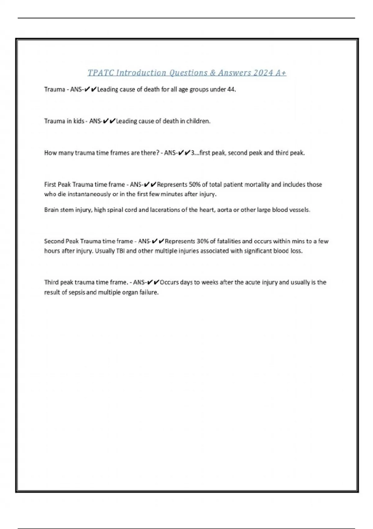 TPATC Introduction Questions & Answers 2024 A+ Trauma - ANS-Leading cause of death for all age groups under 44. Trauma in kids - ANS-Leading cause of death in children. How many trauma time frames are there? - ANS