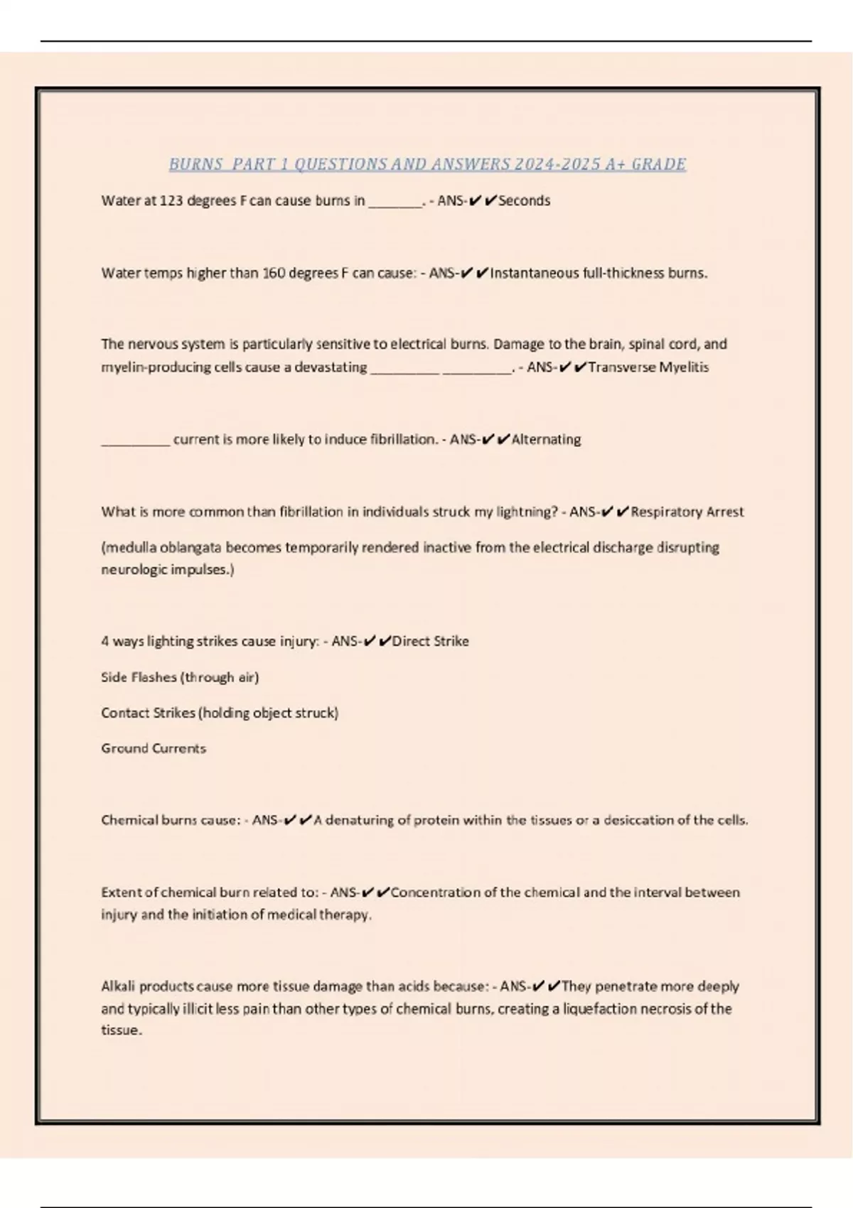 BURNS PART 1 QUESTIONS AND ANSWERS A+ GRADE Water at 123 degrees F can cause burns in _______. - ANS-Seconds Water temps higher than 160 degrees F can cause: - ANS-Instantaneous full-thickness burns. The nervous system is particularly sensitive to electrical burns. Damage to the brain, spinal cord, and myelin-producing cells cause a devastating _________ _________. - ANS-Transverse Myelitis _________ current is more likely to induce fibrillation. - ANS...