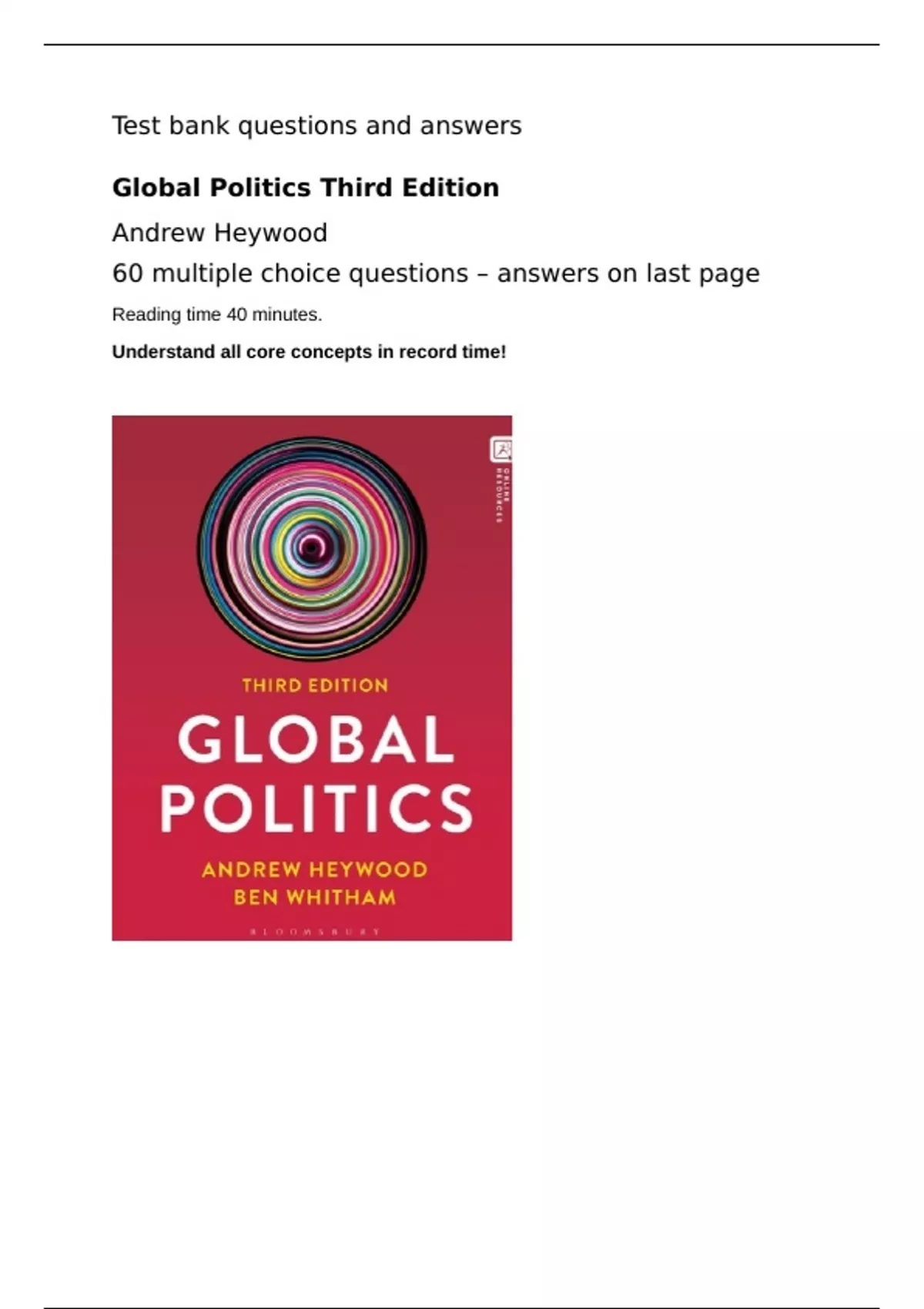 This is a comprehensive test on Global Politics the 3rd edition. 60 multiple choice questions, I put the answers on the last page. You will understand the most important core concepts in record time.
