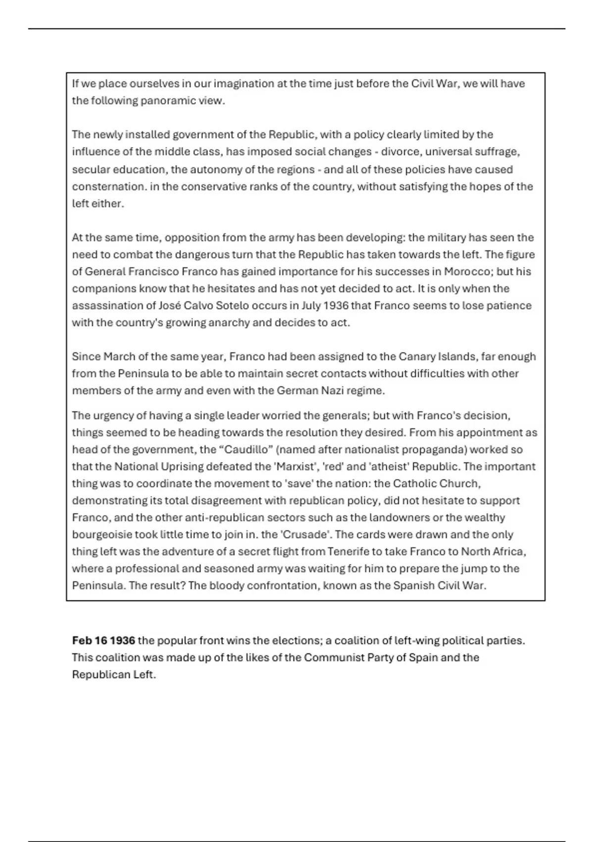 Feb 16 1936 the popular front wins the elections; a coalition of left-wing political parties.