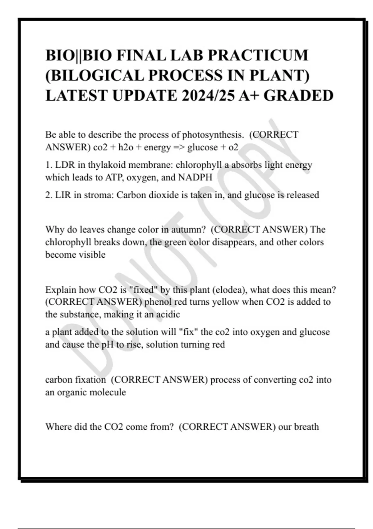 BIO||BIO FINAL LAB PRACTICUM (BILOGICAL PROCESS IN PLANT) LATEST UPDATE 2024/25 A+ GRADED