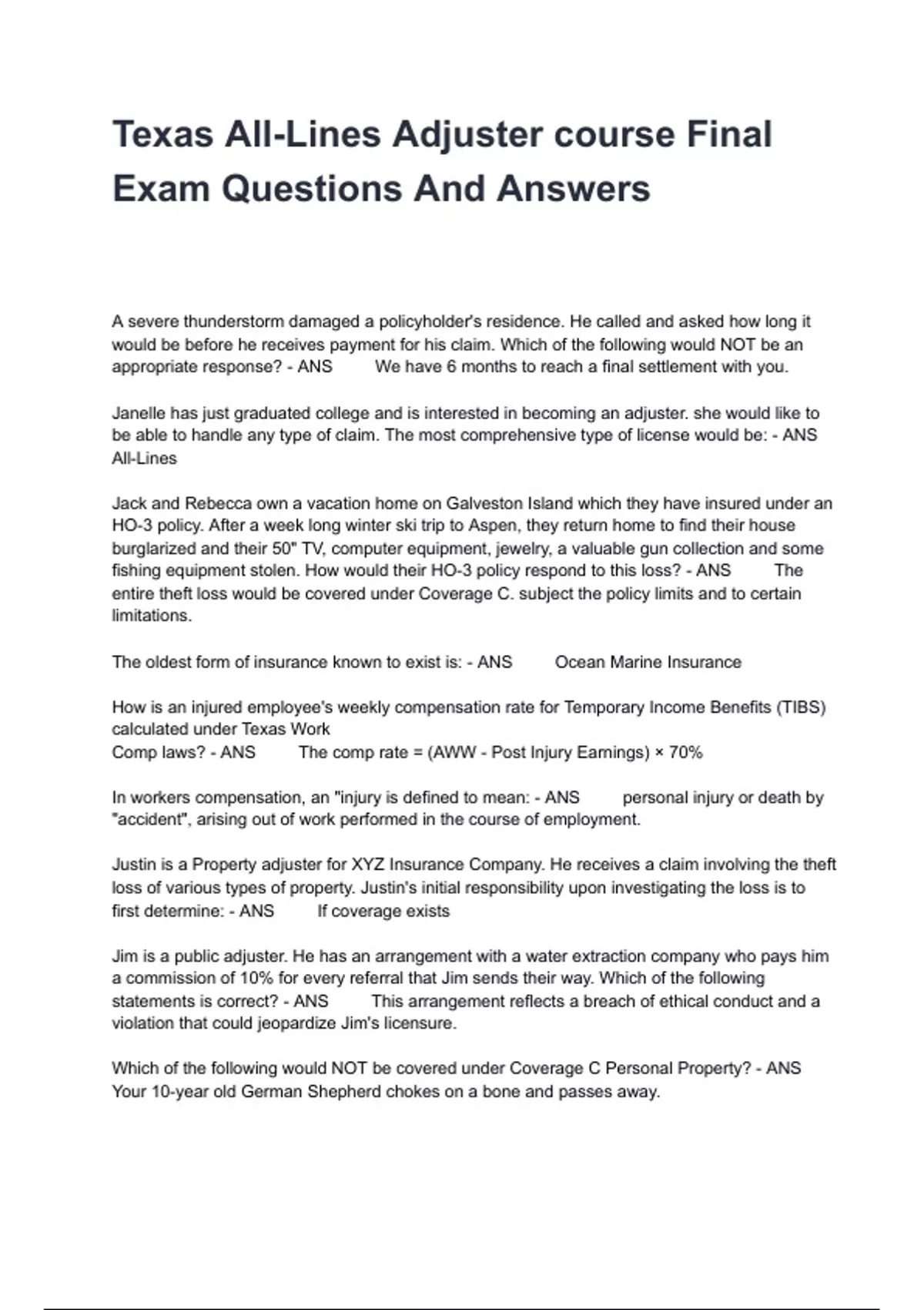 A severe thunderstorm damaged a policyholder's residence. He called and asked how long it would be before he receives payment for his claim. Which of the following would NOT be an appropriate response? - ANS We have 6 months to reach a final settlement with you. Janelle has just graduated college and is interested in becoming an adjuster. she would like to be able to handle any type of claim. The most comprehensive type of license would be: - ANS All-Lines Jack and Rebecca own a vacation home on Galveston Island which they have insured under an HO-3 policy. After a week long winter ski trip to Aspen, they return home to find their house burglarized and their 50" TV, computer equipment, jewelry, a valuable gun collection and some fishing equipment stolen. How would their HO-3 policy respond to this loss? - ANS The entire theft loss would be covered under Coverage C. subject the policy limits and to certain limitations. The oldest form of insurance known to exist is: - ANS Ocean Marine Insurance How is an injured employee's weekly compensation rate for Temporary Income Benefits (TIBS) calculated under Texas Work Comp laws? - ANS The comp rate = (AWW - Post Injury Earnings) × 70% In workers compensation, an "injury is defined to mean: - ANS personal injury or death by "accident", arising out of work performed in the course of employment. Justin is a Property adjuster for XYZ Insurance Company. He receives a claim involving the theft loss of various types of property. Justin's initial responsibility upon investigating the loss is to first determine: - ANS If coverage exists Jim is a public adjuster. He has an arrangement with a water extraction company who pays him a commission of 10% for every referral that Jim sends their way. Which of the following statements is correct? - ANS This arrangement reflects a breach of ethical conduct and a violation that could jeopardize Jim's licensure. Which of the following would NOT be covered under Coverage C Personal Property? - ANS Your 10-year old German Shepherd chokes on a bone and passes away. A tornado strikes a duplex that is insured under a Dwelling (DP-3) policy. Which of the following would NOT be covered by the Dwelling policy? - ANS Damage to another duplex right next door, also owned by the landlord. Common carriers (i.e. 18-wheelers, trains, planes, etc.) are responsible for damage to customer goods they transport EXCEPT for damages resulting from: - ANS Acts of God You have just started your career handling Texas workers' compensation claims. Which one of the following WOULD BE considered a violation of the Texas Unfair Claim Settlement Practices Act? - ANS Not responding to an employee's calls because you're overworked and the claim involves complex issues you just don't feel like addressing. Which type of bond would be used to cover the exposure to employee theft? - ANS Fidelity bond Garrett wants a Texas All Lines Adjuster's license. Which of the following actions will be necessary for Garrett to secure such a license? - ANS Pass a state qualifying exam or pre-licensing course that is certified by the Texas Department of Insurance that includes an approved, comprehensive final examination of 150 questions, and attach the Certificate of Completion to an application for licensure. The DP.3 Dwelling form is an "Open Risk" policy. This means that: - ANS All risks of direct physical loss are covered unless they are excluded Assume your home caught fire due to a faulty electrical device. and one month after the fire you receive a bill from the fire department for $450.00 for responding to the fire. Would this be paid under your homeowner's policy? - ANS Yes. It is called Fire Department Service Charge and is an Additional Coverage provided under the policy, limited to $500. Generally, if an employee suffers an occupational injury and accepts workers' compensation benefits, he or she: - ANS Gives up the right to sue the employer for personal injury and pain and suffering. The employee can only make claim for workers' compensation benefits. Janelle has a Texas Personal Auto Policy with 30/60/25 policy limits. She hits a car with 4 occupants, all of whom are hurt. They all sue. Each of the injured parties receives identical verdicts of $40,000. Under Janelle's bodily injury liability coverage, what is the total amount that the company would pay for the injuries to these plaintiffs? - ANS $60,000 A person or entity who guarantees the performance or payment of one party who is obligated by contract to another is called a: - ANS Surety If your insured were to ask you if a Dwelling policy would pay for his loss of rental income after a fire loss while the property is being repaired. what would you tell him? - ANS Yes, and it's called Fair Rental Value coverage and is available under Coverage D. Fred runs a convenience store that sells gasoline. One day a customer pulls away from the pump while the gas is still pumping, breaks the pump line and causes gasoline to escape all over the parking lot and into the storm drain. Fred files a claim under his commercial property policy. Damage to repair the pump totals $545.00 and $257.00 worth of gasoline was pumped out before anyone noticed and stopped the pump. The local HazMat team was called out by the authorities to clean up the parking lot and the storm drain. Fred received a bill from the County for $12.850.00 for the clean up. He sends the bill to you to pay. What kind of coverage is available to Fred as a commercial property extension of coverage needed to pay this loss? - ANS Pollution Clean Up and Removal A cargo ship loaded with lumber and sailing from Seattle, Washington to Tokyo, Japan, encountered "the perfect storm" during its trip across the Pacific Ocean. Some of the lumber was thrown overboard to save the ship. This action is called: - ANS Jettison Roberto owns a house on Lake Conroe. The house is insured with an HO-3 policy. During a storm, a tornado touches down and severely damages the 
