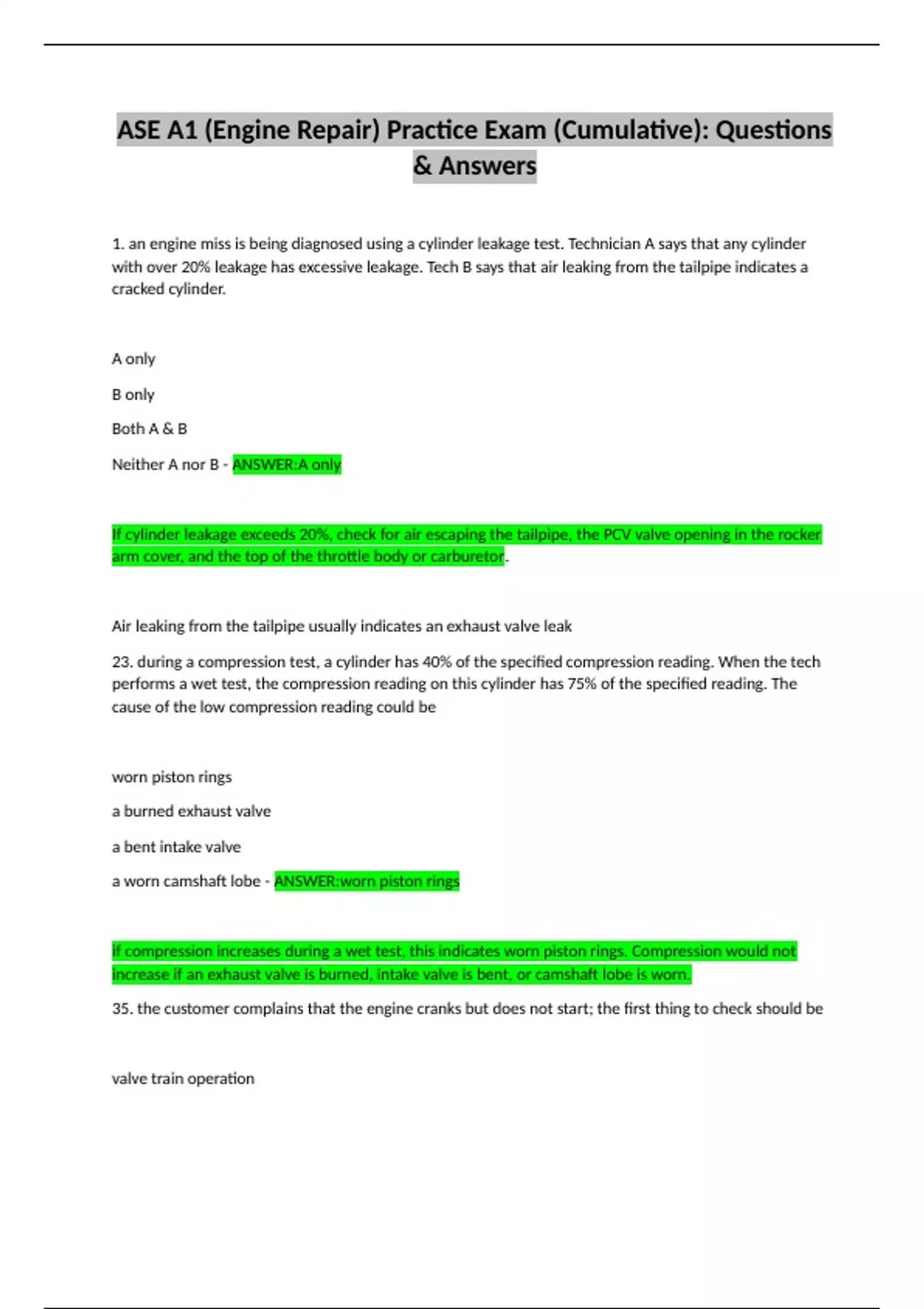 23. during a compression test, a cylinder has 40% of the specified compression reading. When the tech