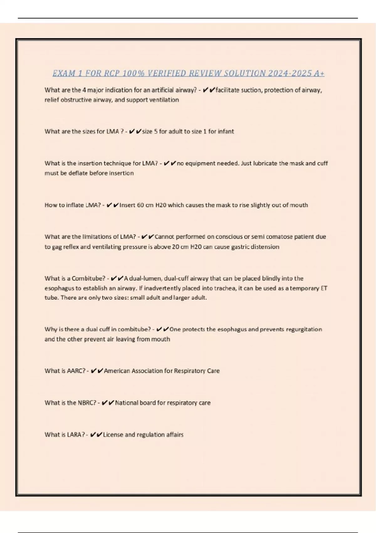EXAM 1 FOR RCP 100% VERIFIED REVIEW SOLUTION A+ What are the 4 major indication for an artificial airway? - facilitate suction, protection of airway, relief obstructive airway, and support ventilation What are the sizes for LMA ? - size 5 for adult to size 1 for infant What is the insertion technique for LMA? - no equipment needed. Just lubricate the mask and cuff must be deflate before insertion How to inflate LMA? - Insert 60 cm H20 which causes the mask to rise slightly out of mouth What are the limitations of LMA? - Cannot performed on conscious or semi comatose patient due to gag reflex and ventilating pressure is above 20 cm H20 can cause gastric distension What is a Combitube? - A dual-lumen, dual-cuff airway that can be placed blindly into the esophagus to establish an airway. If inadvertently placed into trachea, it can be used as a temporary ET tube. There are only two sizes: small adult and larger adult. Why is there a dual cuff in combitube? - ... CONTINUES...