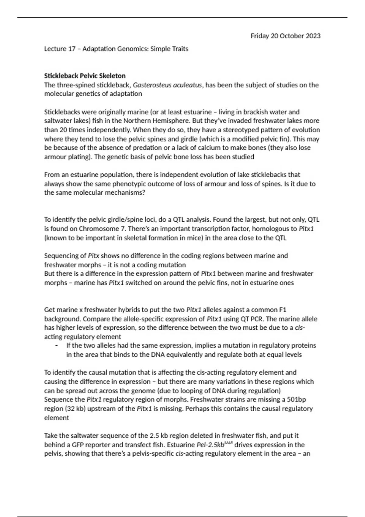 These lecture notes provide a detailed examination of the genetic basis of simple adaptive traits, highlighting key case studies and molecular mechanisms. The lecture notes explore how genetic mutations drive adaptation in natural populations and the methodologies used to uncover these associations, making it a valuable resource for understanding the genomic underpinnings of simple traits. Stickleback Pelvic Skeleton: A detailed case study on the three-spined stickleback (Gasterosteus aculeatus), showcasing how the repeated loss of pelvic spines and girdles in freshwater populations is linked to deletions in the Pitx1 enhancer region. The lecture explains the molecular basis of this convergence, the role of cis-regulatory mutations, and experimental evidence supporting these findings. Lizard Pigmentation: An exploration of pale morphs in lizards as an adaptation to white sand dunes. This example highlights how independent populations evolved pigmentation changes through mutations in the MC1R gene, a well-known regulator of vertebrate pigmentation. Functional assays demonstrate how these mutations result in loss of receptor function, convergently leading to pale phenotypes. General Framework for Identifying Adaptive Traits: Provides a systematic approach to identifying the genetic basis of adaptation, including using candidate genes, QTL analysis, functional studies, and examining signatures of selection. Emphasis is placed on understanding the predictability of evolution and the recurring involvement of specific genes in adaptive changes. This document is ideal for students seeking to understand how simple traits evolve through genetic mutations and the methodologies used to uncover their genetic basis. It blends theoretical knowledge with practical examples to illustrate core concepts in adaptation genomics.