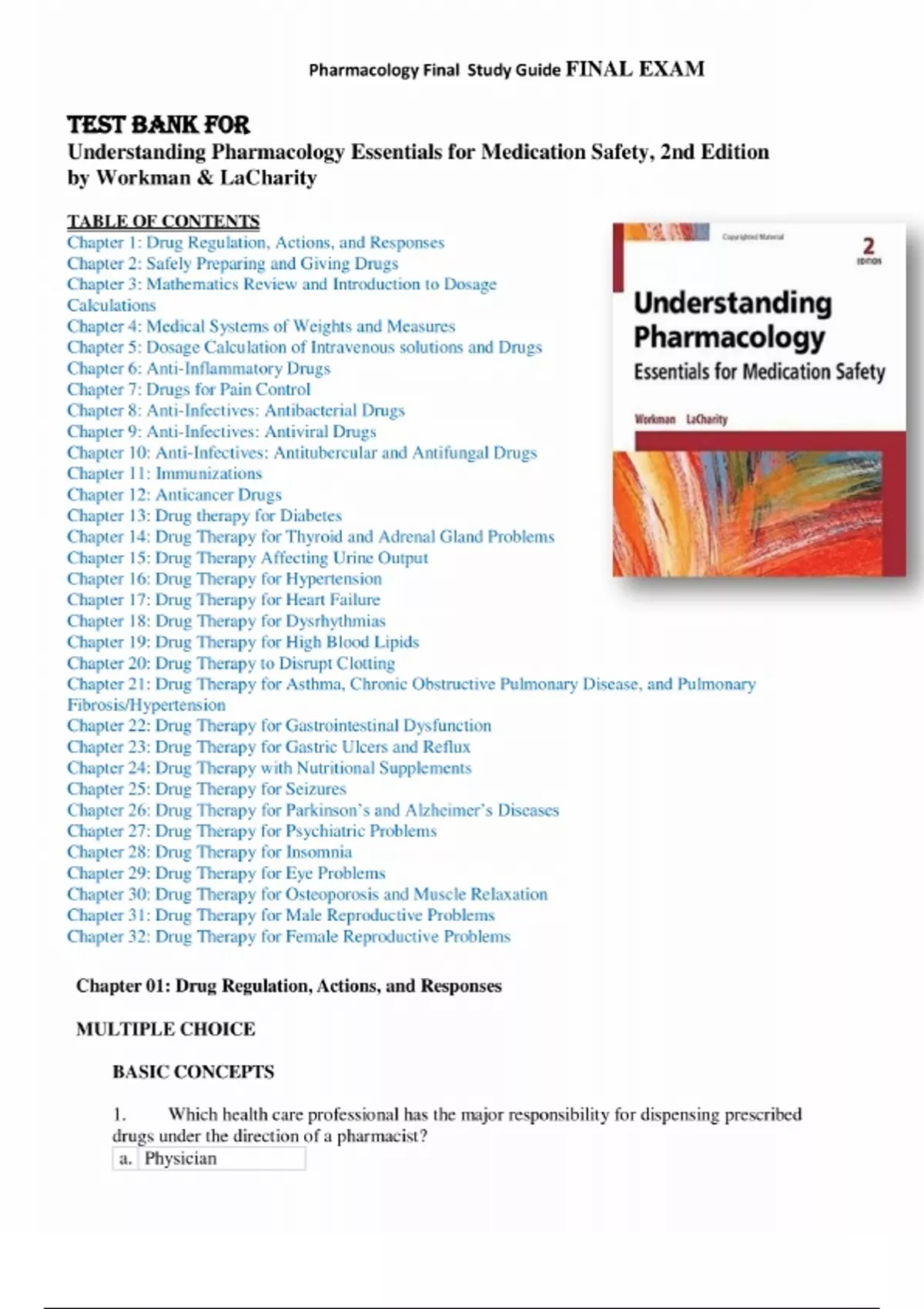 TEST BANK FOR Understanding Pharmacology, Essentials for Medication Safety, 2nd Edition, Workman & La Charity 100% A+ GRADED( ALL CHAPTERS COVERED) view and download the document after buying