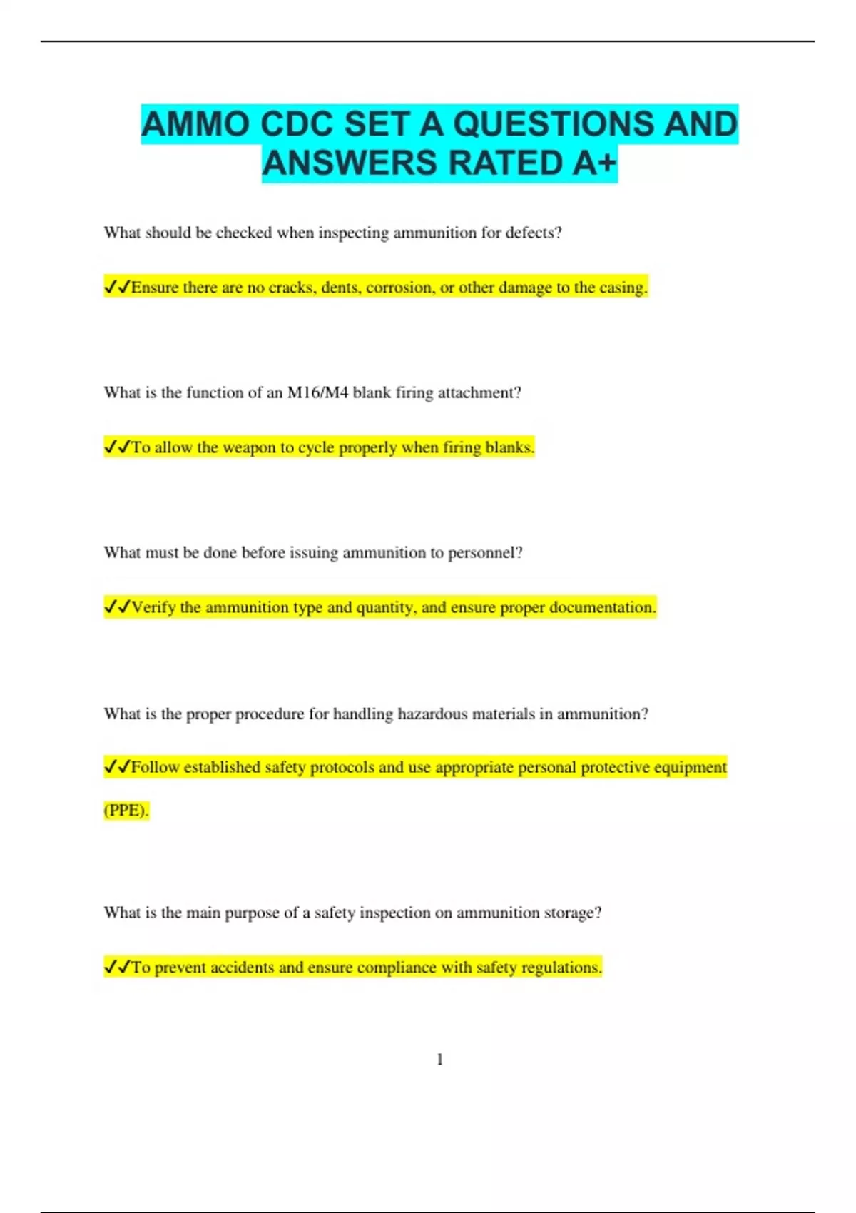 AMMO CDC SET A QUESTIONS AND ANSWERS RATED A+ What should be checked when inspecting ammunition for defects? Ensure there are no cracks, dents, corrosion, or other damage to the casing. What is the function of an M16/M4 blank firing attachment? To allow the weapon to cycle properly when firing blanks. What must be done before issuing ammunition to personnel? Verify the ammunition type and quantity, and ensure proper documentation. What is the proper procedure for handling hazardous materials in ammunition? Follow established safety protocols and use appropriate personal protective equipment (PPE). What is the main purpose of a safety inspection on ammunition storage? To prevent accidents and ensure compliance with safety regulations. 2 How should ammunition be stored in a facility? In a cool, dry, and secure area, following the prescribed stacking and segregation guidelines. What is the role of a round's primer in ammunition? To ignite the propellant charge when struck by the firing pin. What is the correct way to dispose of outdated or defective ammunition? Follow disposal procedures outlined by safety regulations and hazardous materials protocols. How can the condition of stored ammunition be monitored? By regularly inspecting for corrosion, leakage, or other signs of deterioration. What is the purpose of a storage location’s fire suppression system in an ammunition facility? To quickly suppress any fires and prevent damage to stored ammunition. What should be done if an ammunition malfunction occurs during testing? Cease testing immediately, report the malfunction, and follow safety protocols for disposal. 3 What is the definition of “ammunition accountability”? The process of tracking and verifying all ammunition from receipt to use or disposal. What is the function of an ammunition lot number? To identify and trace the origin, production, and history of a specific batch of ammunition. What safety measures are essential when transporting ammunition? Use secure containers, follow route safety protocols, and ensure proper documentation. What is the role of an ammunition surveillance program? To monitor the condition and serviceability of stored ammunition and prevent deterioration. What is the purpose of using a “dangerous cargo manifest” during ammunition transport? To ensure all transported ammunition is properly documented and handled according to safety standards. How should live ammunition be handled during training exercises? 4 Follow all safety protocols, including using dummy rounds and keeping live ammunition securely stored. What should be done if ammunition is dropped from a height? Inspect the ammunition for visible damage and report any concerns to supervisors. What is the importance of a weapons inspection before ammunition loading? To ensure the weapon is in proper working