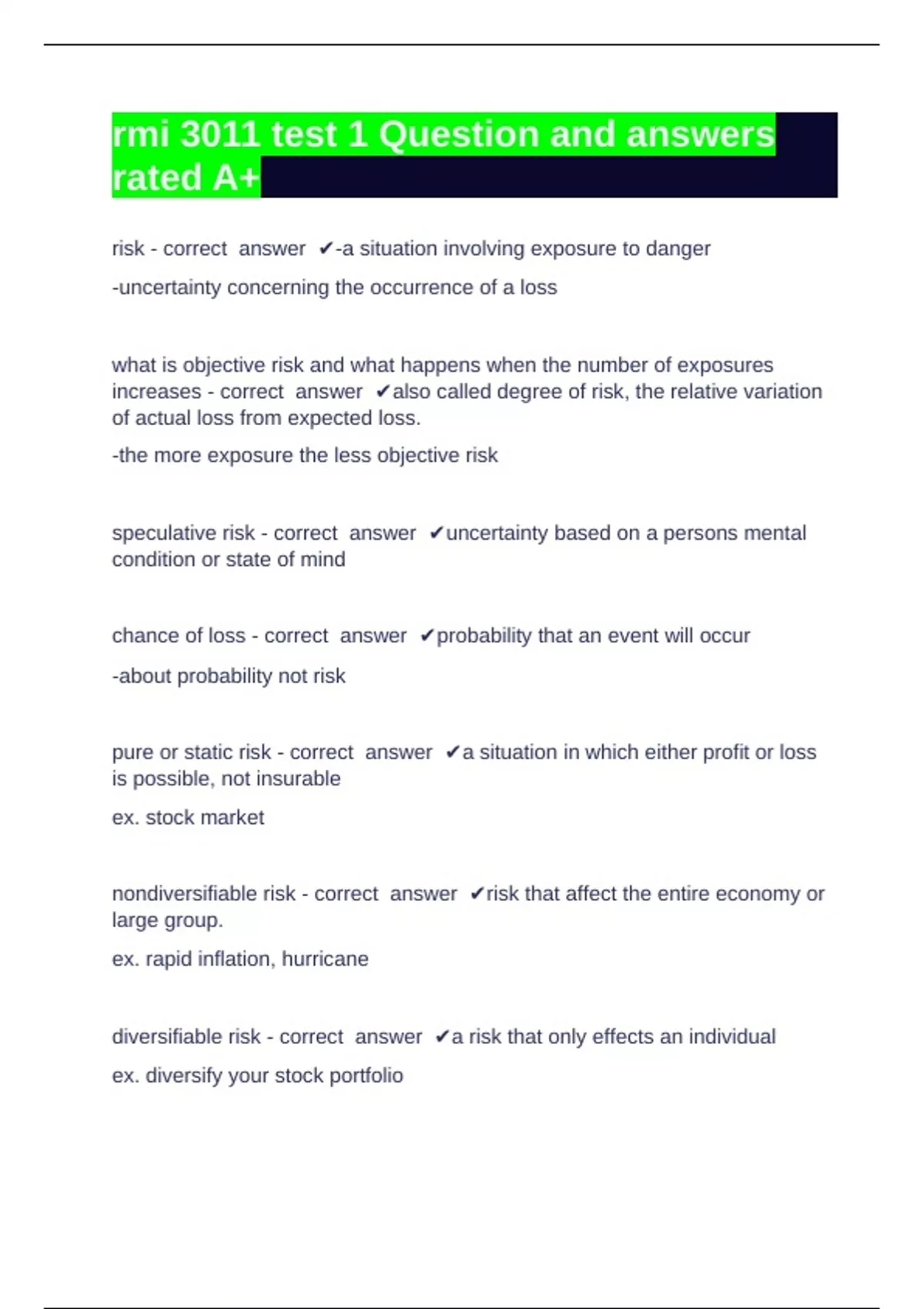 pure or static risk - correct answer ✔a situation in which either profit or loss