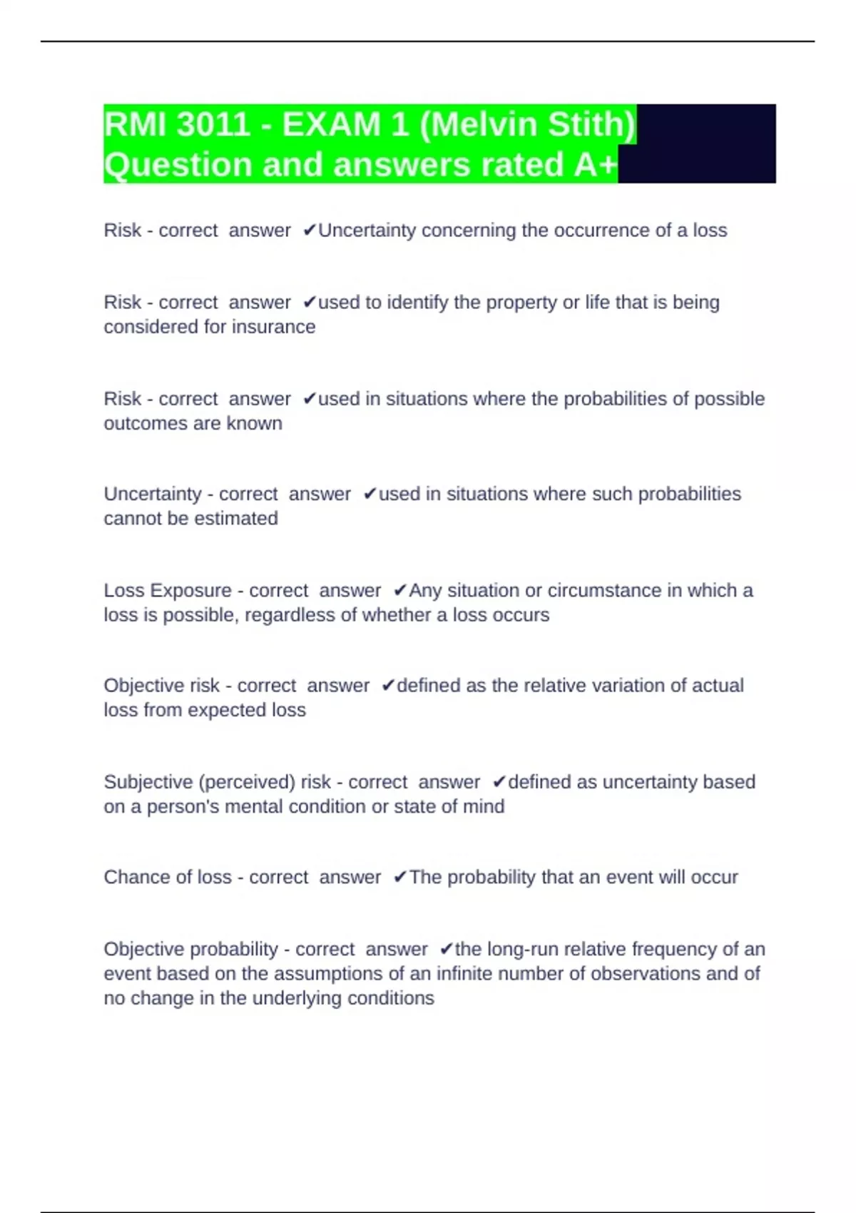 Subjective (perceived) risk - correct answer ✔defined as uncertainty based