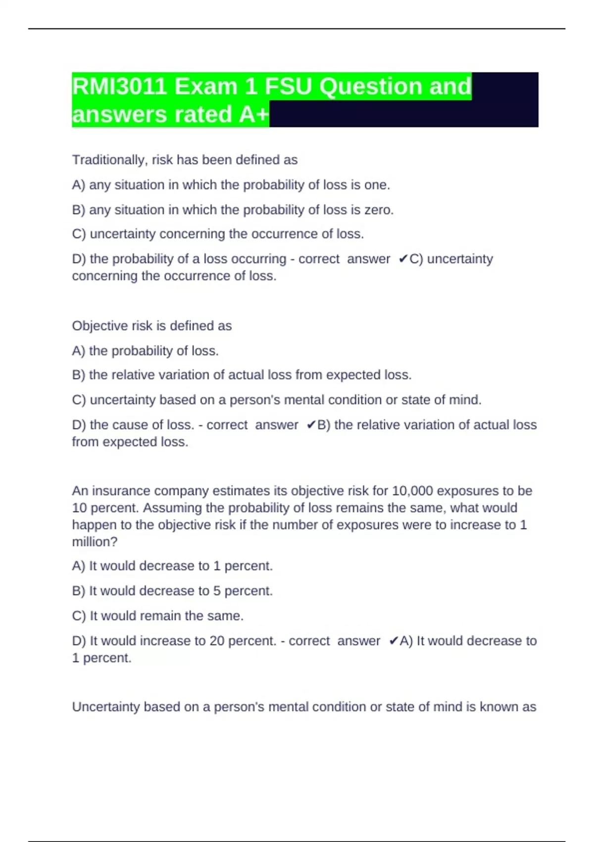 D) subjective risk. - correct answer ✔A) objective probability.