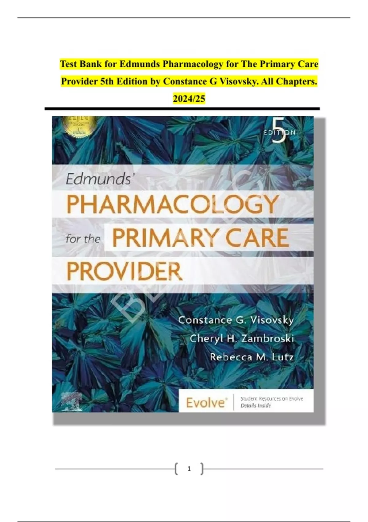 Test Bank for Edmunds Pharmacology for The Primary Care Provider 5th Edition by Constance G Visovsky. All Chapters. 2024/25. is written for Nurse Practitioners, other Advanced Practice Nursing prescribers, and Physician Assistants. Unlike other pharmacotherapeutics textbooks, it focuses on the drugs most commonly used in primary care settings. A new chapter format and body-system approach make learning easier, and standardized clinical guidelines ensure best practices in pharmacotherapeutics. Updated and impeccably accurate drug content includes the latest drug classes, specific drugs, and therapeutic uses in primary care. Continuing to emphasize health promotion strategies, this new edition includes new chapters on pharmacogenetics, drugs for ADHD, nutritional supplements, and more.