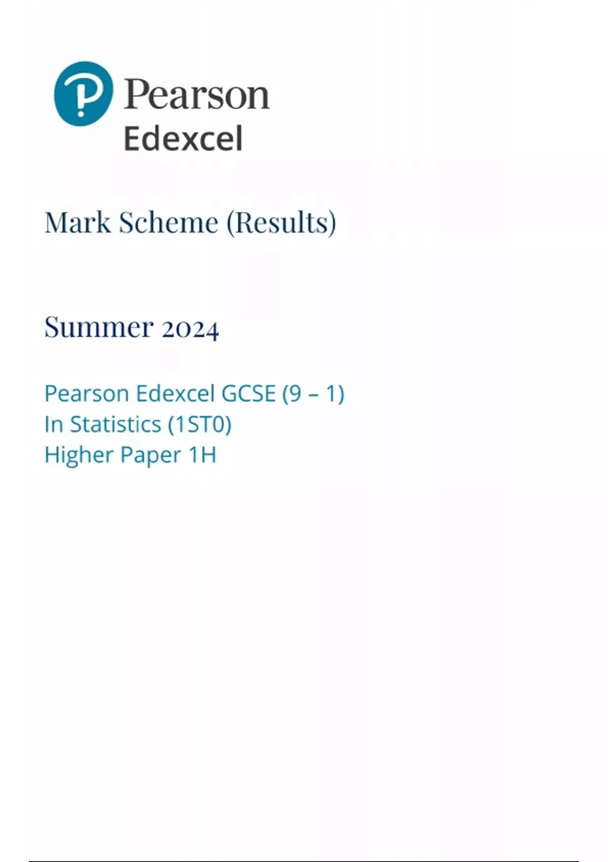 2024 PEARSON EDEXCEL GCSE STATISTICS MARK SCHEME PAPER 1H (1STO : Higher)