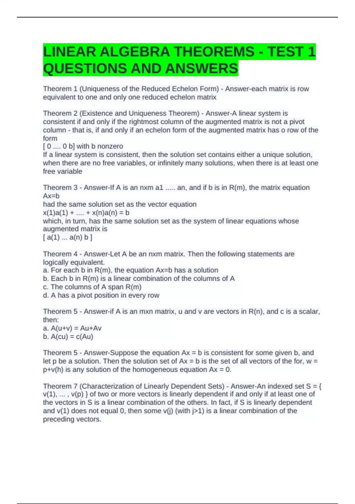 LINEAR ALGEBRA THEOREMS - TEST 1 QUESTIONS AND ANSWERS