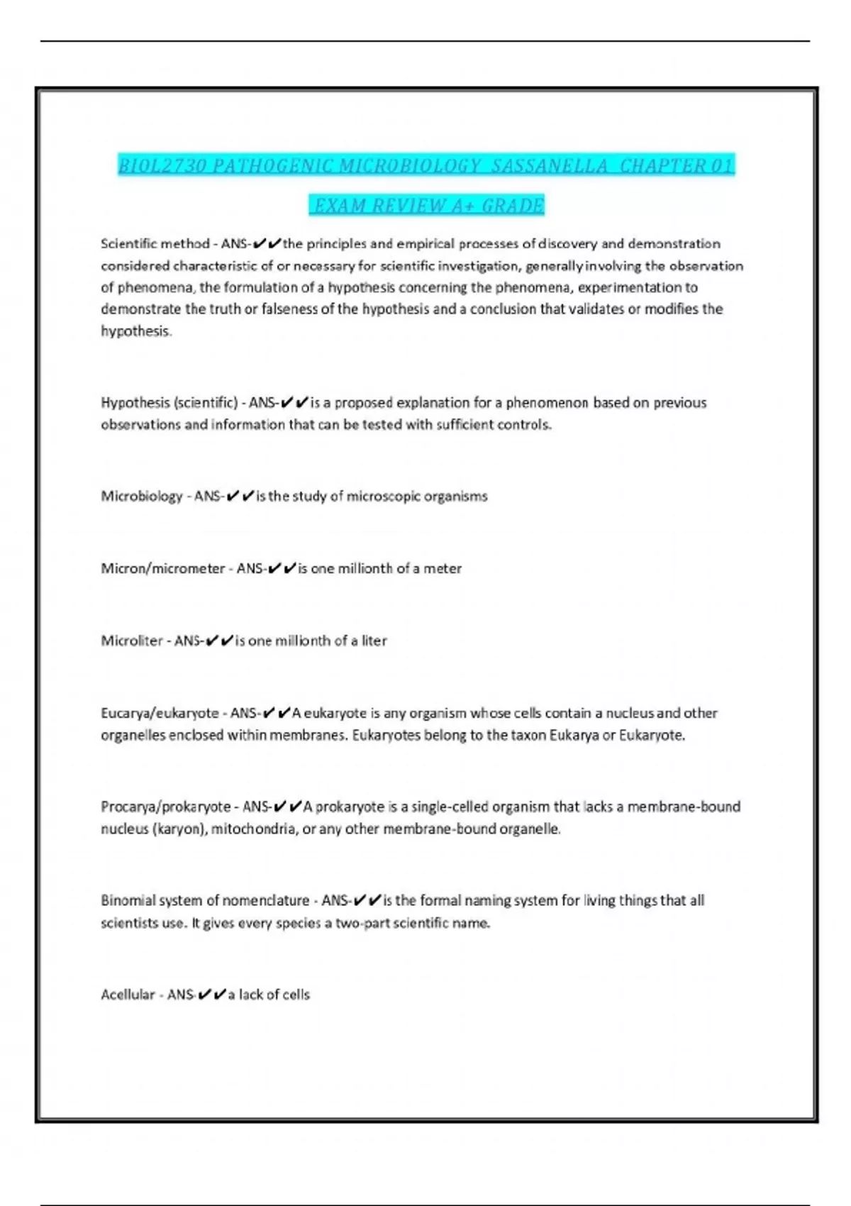BIOL2730 PATHOGENIC MICROBIOLOGY SASSANELLA CHAPTER 01 EXAM REVIEW A+ GRADE Scientific method - ANS-the principles and empirical processes of discovery and demonstration considered characteristic of or necessary for scientific investigation, generally involving the observation of phenomena, the formulation of a hypothesis concerning the phenomena, experimentation to demonstrate the truth or falseness of the hypothesis and a conclusion that validates or modifies the hypothesis. Hypothesis (scientific) - ANS-is a proposed explanation for a phenomenon based on previous observations and information that can be tested with sufficient controls. Microbiology - ANS-is the study of microscopic organisms Micron/micrometer - ANS-is one millionth of a meter Microliter - ANS-is one millionth of a liter Eucarya/eukaryote - ANS-A eukaryote is any organism whose cells contain a nucleus and other organelles enclosed within membranes. Eukaryotes belong to the taxon Eukarya or Eukaryote. Procarya/prokaryote - ANS-A prokaryote is a single-celled organism that lacks a membrane-bound nucleus (karyon), mitochondria, or any other membrane-bound organelle. Binomial system of nomenclature - ANS-is the formal naming system for living things that all scientists use. It gives every species a two-part scientific name. Acellular - ANS-a lack of cell