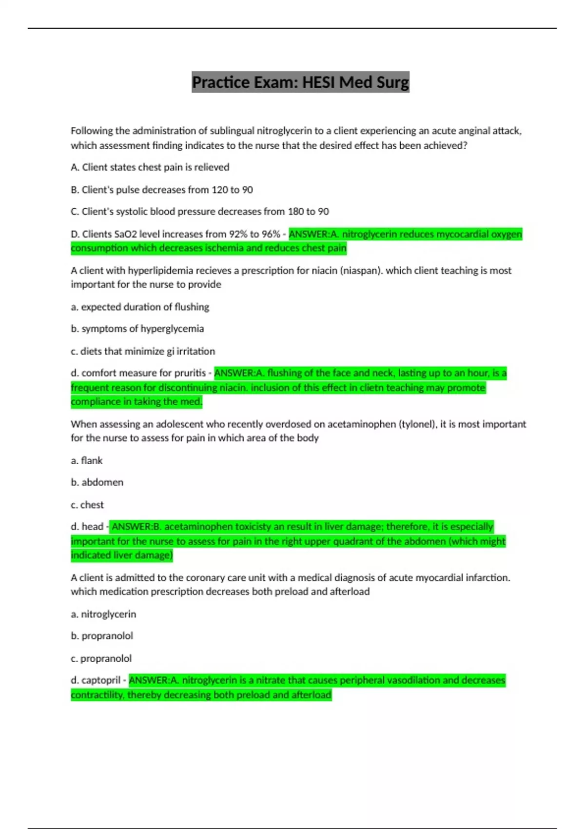 Practice Exam: HESI Med Surg