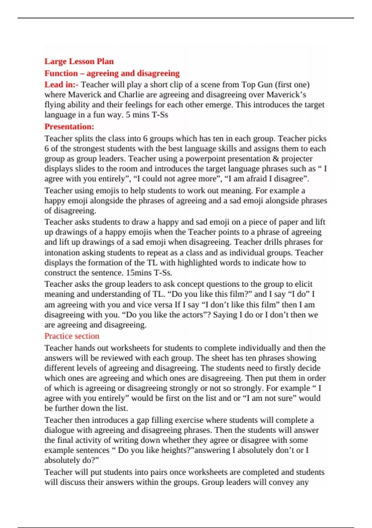 Lesson plan for large class of 60 students