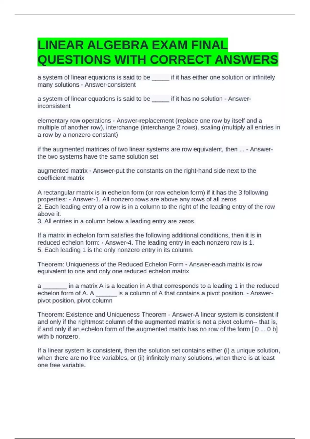 LINEAR ALGEBRA EXAM FINAL QUESTIONS WITH CORRECT ANSWERS