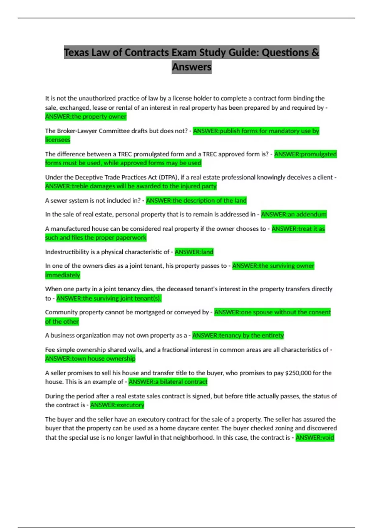 Texas Law of Contracts Exam Study Guide: Questions & Answers