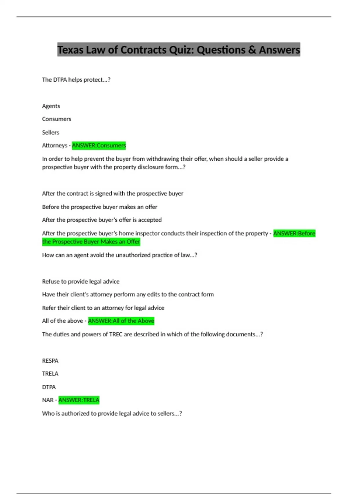 Rules regarding agency relationships - ANSWER:Rules Regarding the Texas Contract Forms