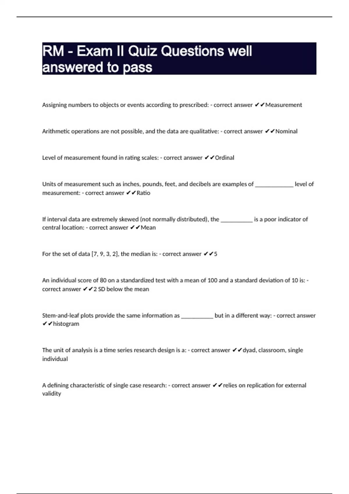 Level of measurement found in rating scales: - correct answer ✔✔Ordinal