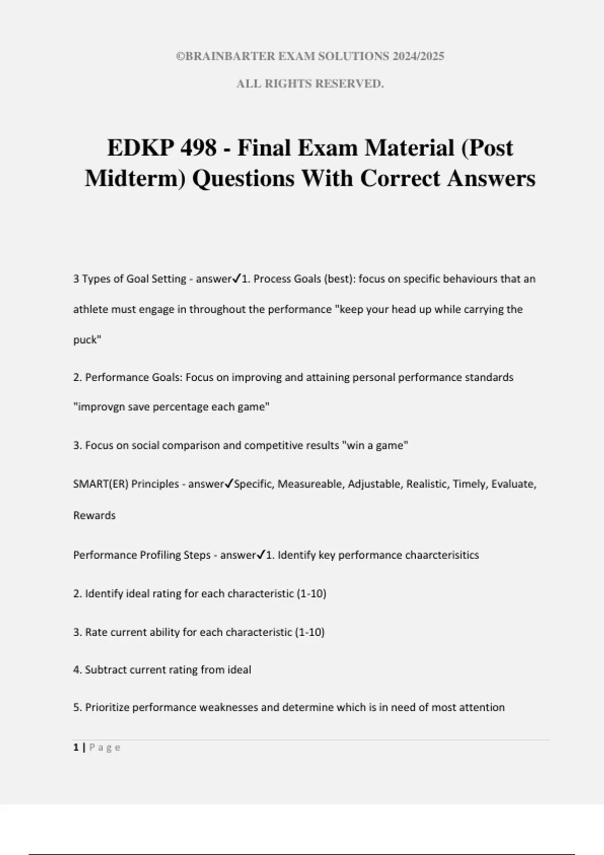 ©BRAINBARTER EXAM SOLUTIONS 2024/2025 ALL RIGHTS RESERVED. 1 | P a g e EDKP 498 - Final Exam Material (Post Midterm) Questions With Correct Answers 3 Types of Goal Setting - answer1. Process Goals (best): focus on specific behaviours that an athlete must engage in throughout the performance "keep your head up while carrying the puck" 2. Performance Goals: Focus on improving and attaining personal performance standards "improvgn save percentage each game" 3. Focus on social comparison and competitive results "win a game" SMART(ER) Principles - answerSpecific, Measureable, Adjustable, Realistic, Timely, Evaluate, Rewards Performance Profiling Steps - answer1. Identify key performance chaarcterisitics 2. Identify ideal rating for each characteristic (1-10) 3. Rate current ability for each characteristic (1-10) 4. Subtract current rating from ideal 5. Prioritize performance weaknesses and determine which is in need of most attention ©BRAINBARTER EXAM SOLUTIONS 2024/2025 ALL RIGHTS RESERVED. 2 | P a g e Common Problems with Goal Setting - answer- setting too many goals - athletes do not "buy into it" - failure to recognie individual differences - underestimating the time required for effective goal setting programs - failure to provide athletes with follow-up Define Self-Talk What are the 2 types? - answer- verbalizations or statments addressed to the self, multidimensional in nature, and have interpretive elements associated with their context 1. Intructional Self Talk 2. Motivational Self Talk Instructional Self Talk - answerUsed for: - skill development - skill execution - strategy development - general performance improvement ©BRAINBARTER EXAM SOLUTIONS 2024/2025 ALL RIGHTS RESERVED. 3 | P a g e - breaking a bad habit Motivational Self Talk (3 purposes) - answer1. Mastery - eg. building self confidence 2. Arousal - eg. relaxing before competition 3. Drive - eg. increasing effort Task Matching Hypothesis - answerInstructional Statements: high skill, timing, and precision Motivational Statements: muscular strength + endurance 6 Dimensions of Self Talk - answervalence - positive of negative verbalization - overt or covert self-determination - assigned or freely chosen directional interpretation - motivating or demotivating directional intensity - not at all motivating or very much so motivating frequency - often or never History of Imagery (Who, when?) - answerEdmund Jacobson (1931) He imagined his arm moving and found that the neurons were firing even though his arm wasn't moving ©BRAINBARTER EXAM SOLUTIONS 2024/2025 ALL RIGHTS RESERVED. 4 | P a g e What is imagery? - answer- a form of simulation that involves recalling from memory pieces of information stored from experience and shaping those pieces into meaningful images - involves all senses: visual, kinesthetic (feel your body), auditory, tactile, olfactory - more complicated than visualization because it involves all the senses How imagery works: 1. Psychoneuromuscular Theory 2. Symbolic Learning Theory 3. Psychological Skill Hypothesis 3. Bioinformational Theory 4. Triple Code Model - answer1. Psychoneuromuscular Theory: progamming your muscles for action; imagined events innervate the muscles like physical practice of the movement would; strengthens neural pathways 2. Symbolic Learning Theory: understanding movement patterns; imagery functions as a coding system (mental blueprints) 3. Psychological Skill Hypothesis: imagery develops and refines mental skills like concentration and confidence, which reduces anxiety and improves performance 4. Bioinformational Theory: a description of an image consists of two main types of statments: stimulus propositions and response propositions