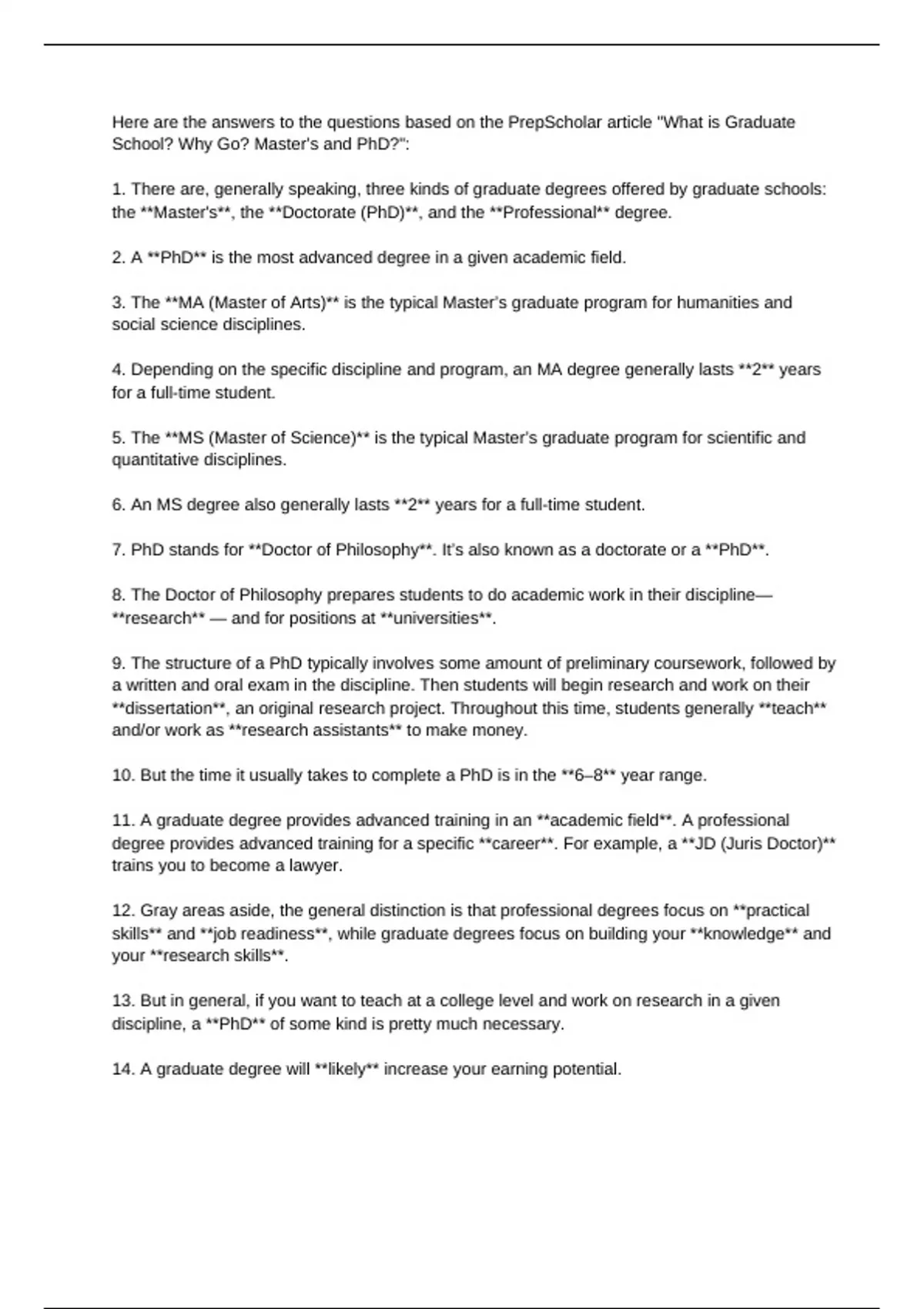 Here are the answers to the questions based on the PrepScholar article "What is Graduate