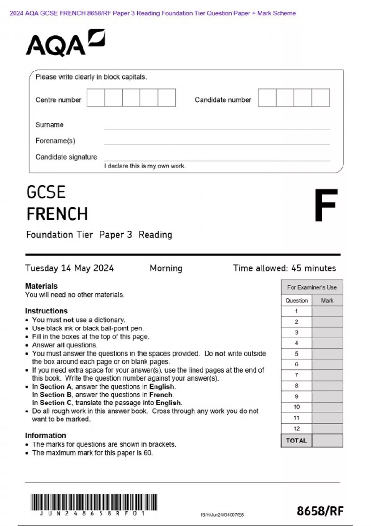 2024 AQA GCSE FRENCH 8658/RF Paper 3 Reading Found
