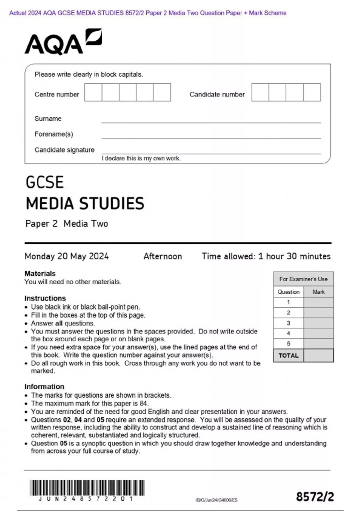 - Actual 2024 AQA GCSE MEDIA STUDIES 8572/2 Paper 2