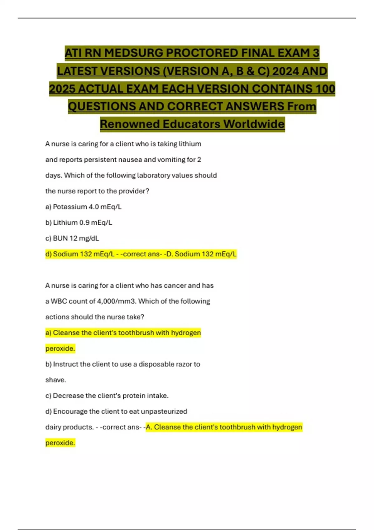 ATI RN Med Surg Proctored Final Exam with High-Quality Questions and Detailed Solutions for Comprehensive Review and Effective Exam Preparation.