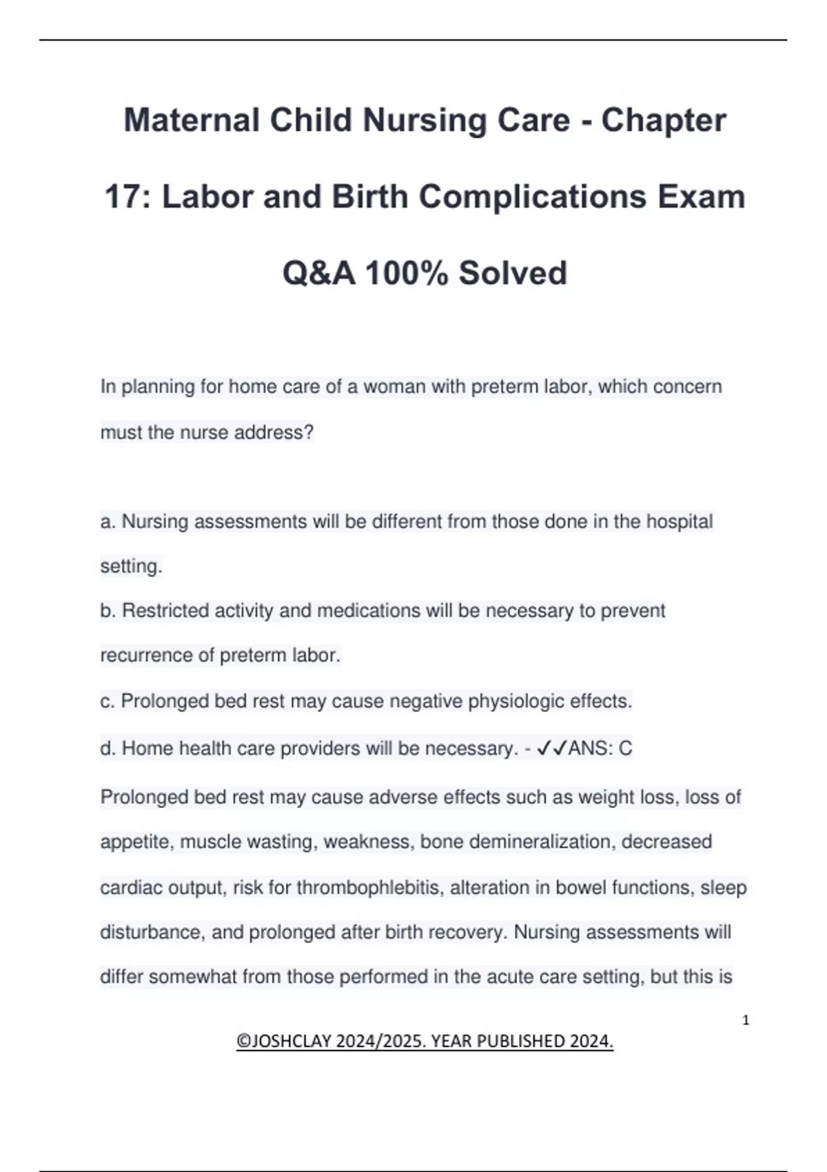 Maternal Child Nursing Care - Chapter 17: Labor and Birth Complications Exam Q&A 100% Solved In planning for home care of a woman with preterm labor, which concern must the nurse address? a. Nursing assessments will be different from those done in the hospital setting. b. Restricted activity and medications will be necessary to prevent recurrence of preterm labor. c. Prolonged bed rest may cause negative physiologic effects. d. Home health care providers will be necessary. - ANS: C Prolonged bed rest may cause adverse effects such as weight loss, loss of appetite, muscle wasting, weakness, bone demineralization, decreased cardiac output, risk for thrombophlebitis, alteration in bowel functions, sleep disturbance, and prolonged after birth recovery. Nursing assessments will differ somewhat from those performed in the acute care setting, but this is