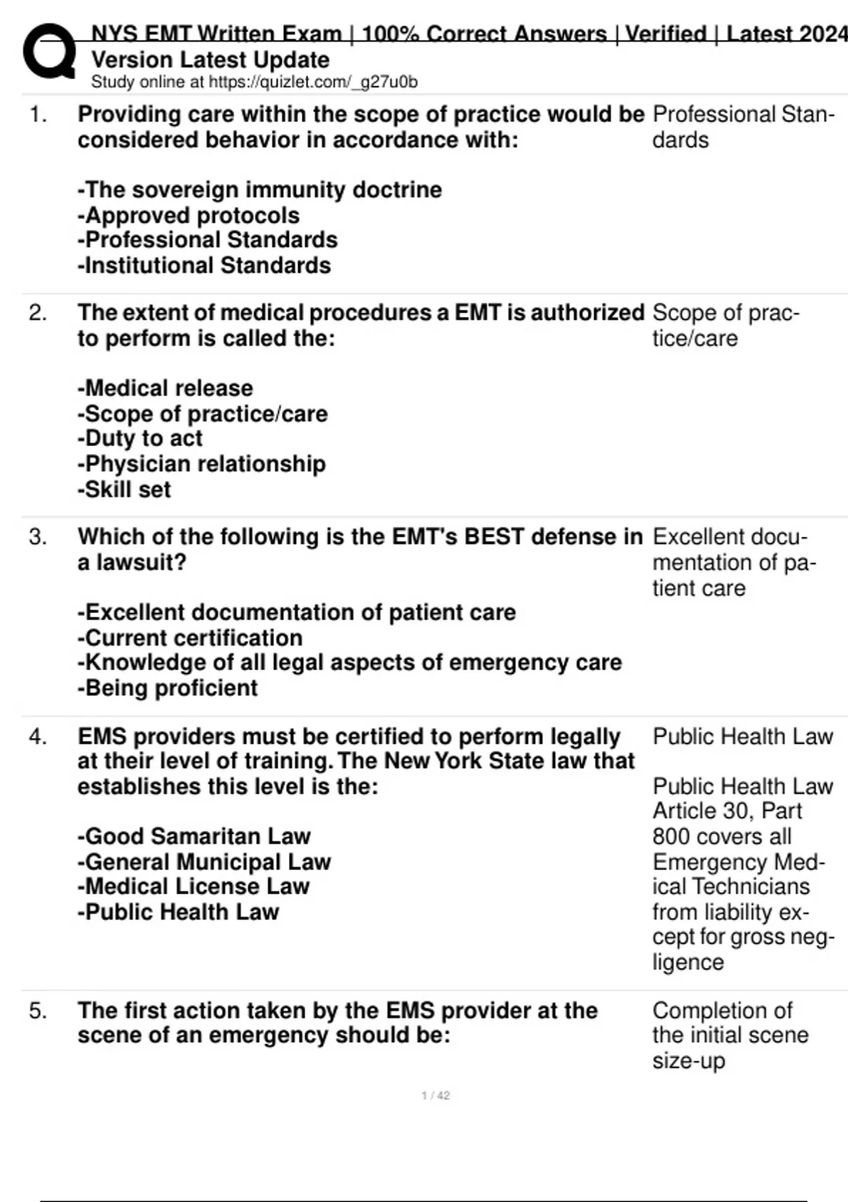 , NYS EMT Written Exam | 100% Correct Answers | Verified | Latest 2024