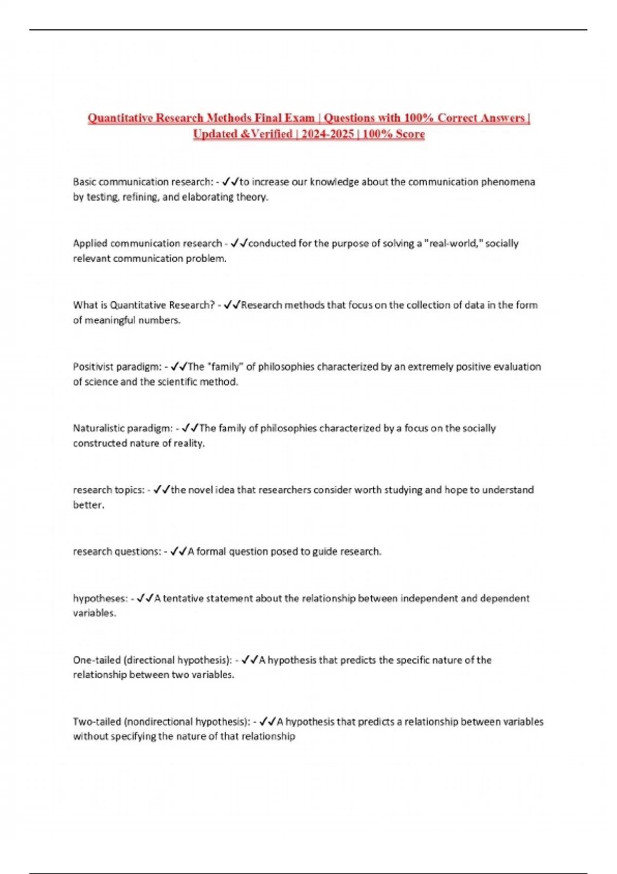 Quantitative Research Methods Final Exam | Questions with 100% Correct Answers | Updated &Verified | | 100% Score
