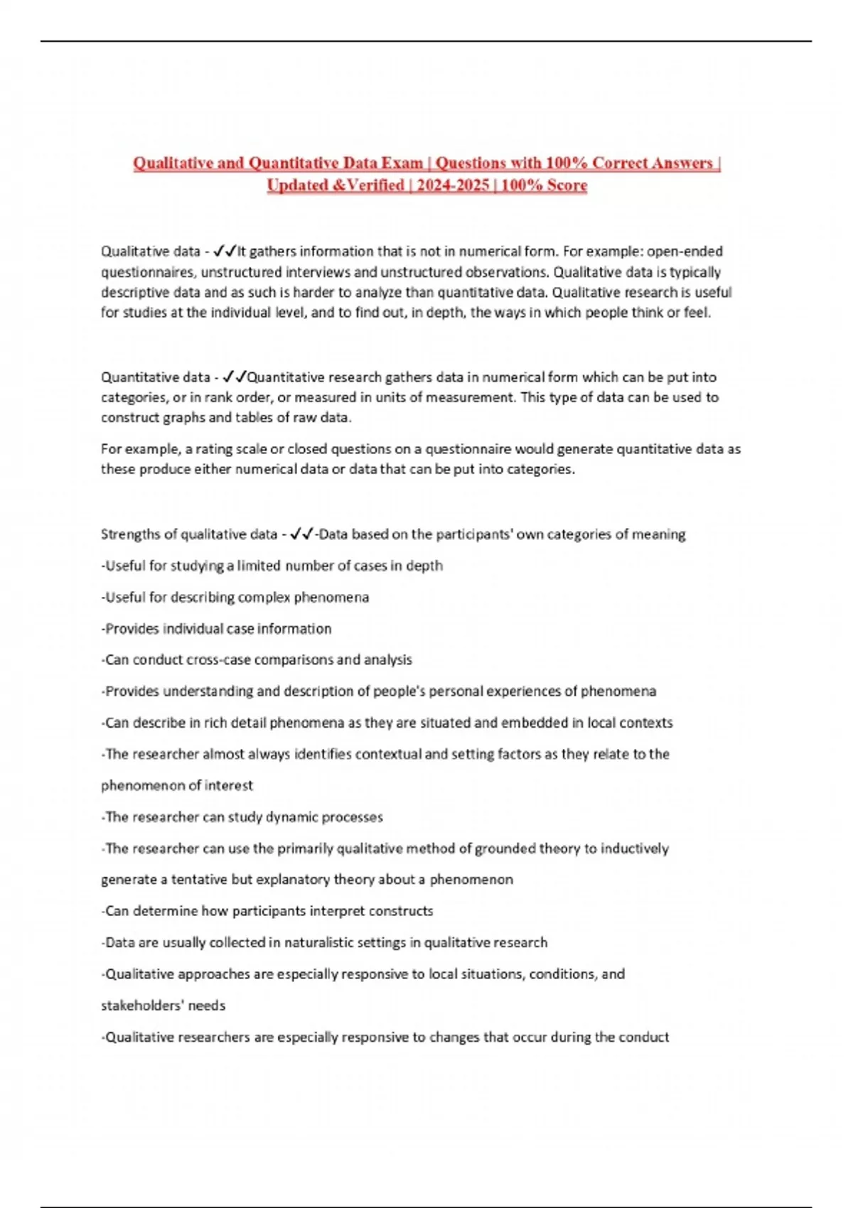 Qualitative and Quantitative Data Exam | Questions with 100% Correct Answers | Updated &Verified | | 100% Score