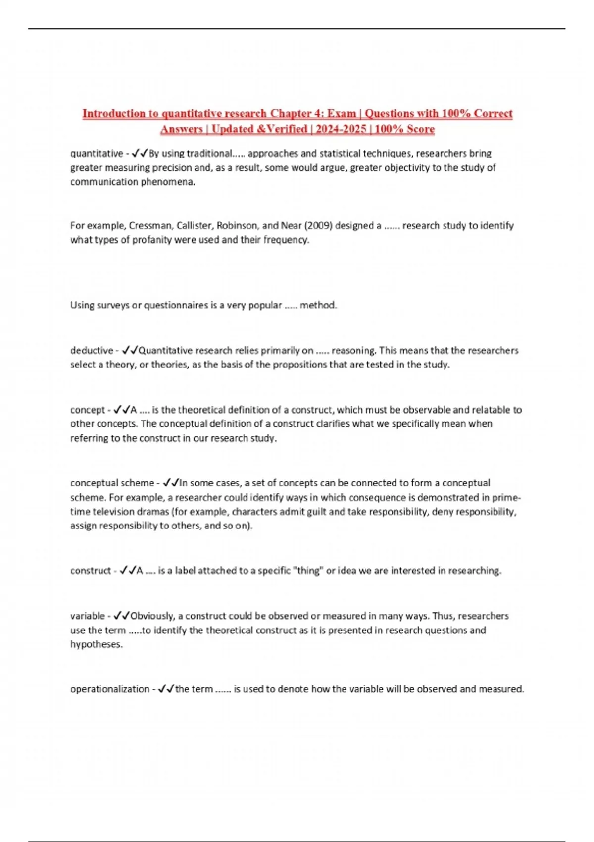 Introduction to quantitative research Chapter 4: Exam | Questions with 100% Correct Answers | Updated &Verified | | 100% Score