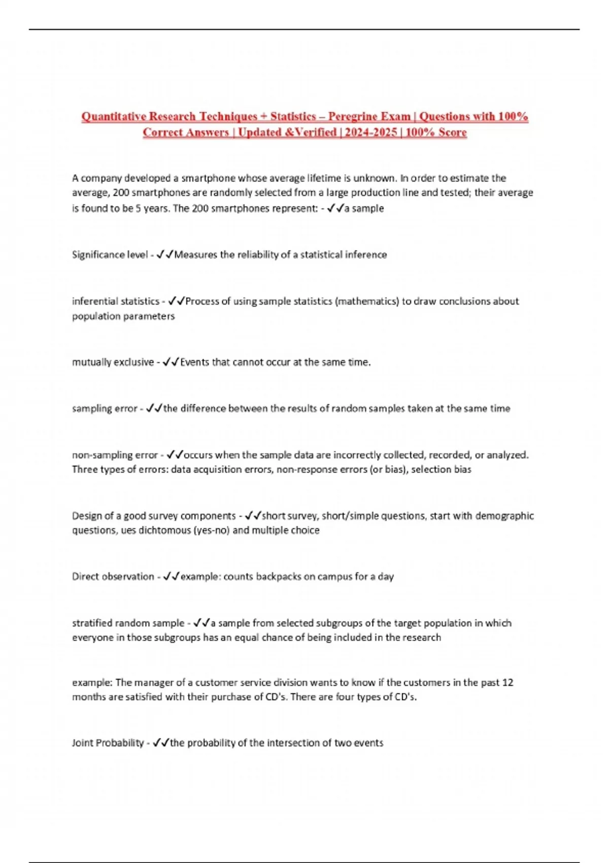 Quantitative Research Techniques + Statistics – Peregrine Exam | Questions with 100% Correct Answers | Updated &Verified | | 100% Score