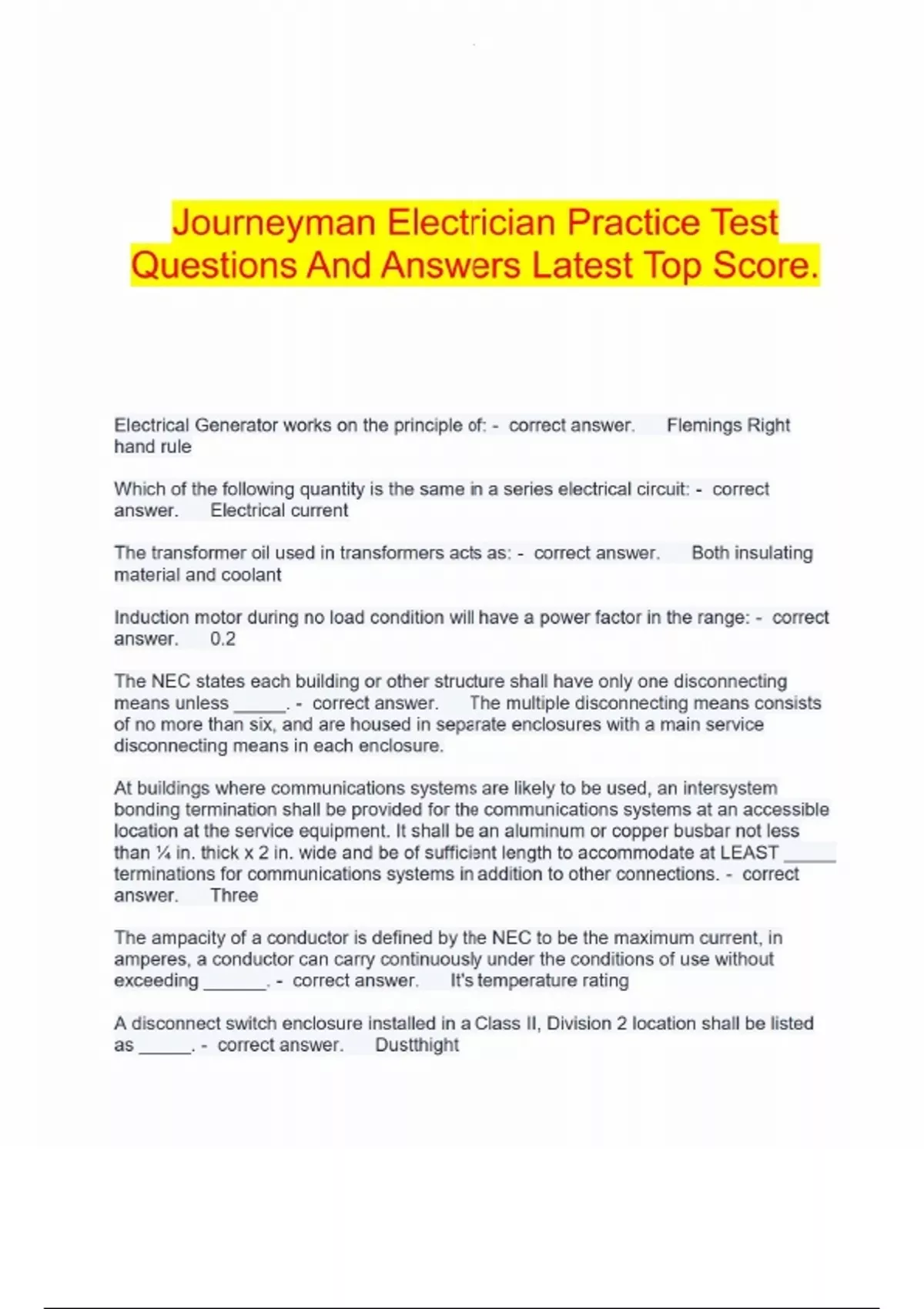 Journeyman Electrician Practice Test Questions And Answers Latest Top Score.