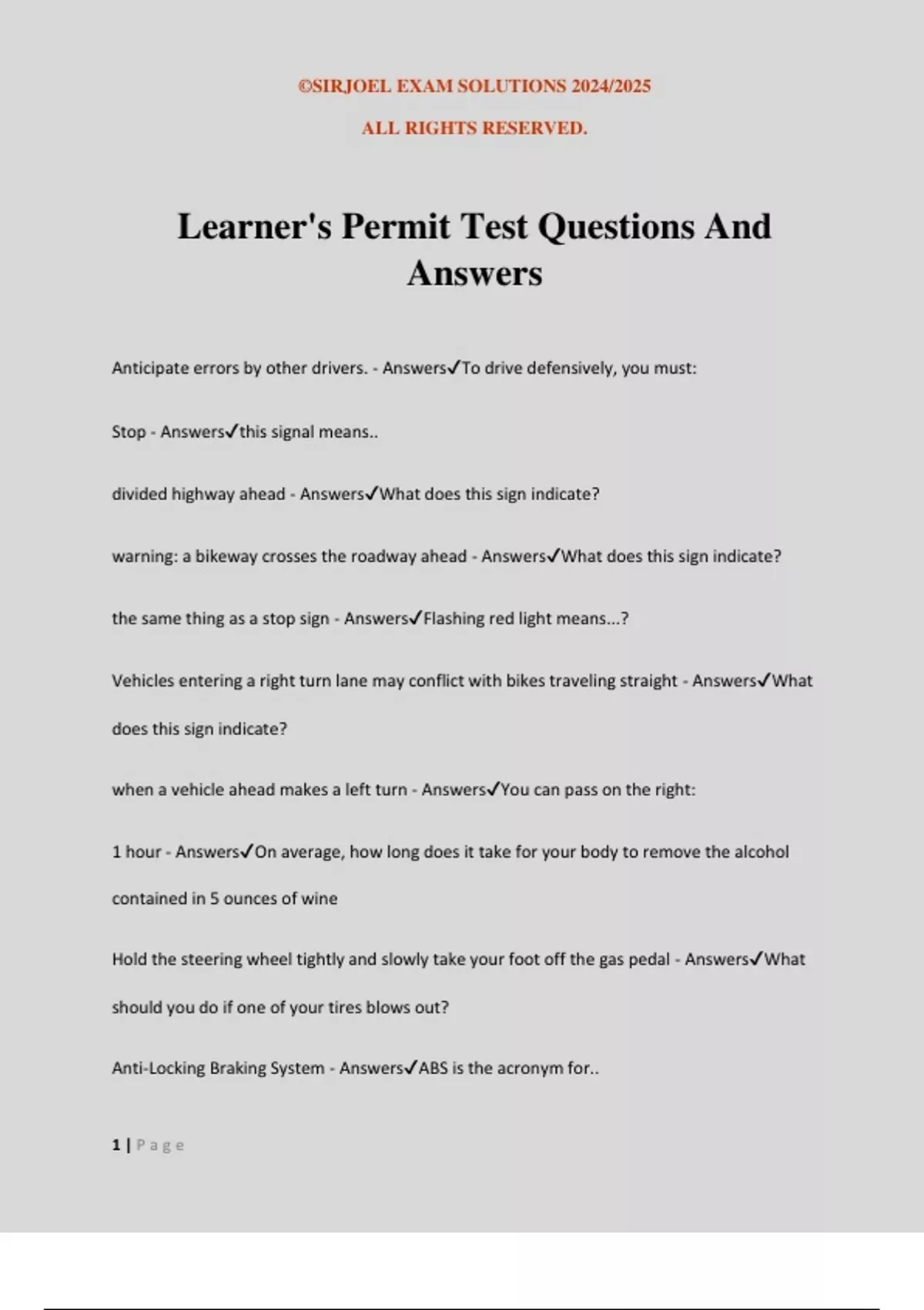 ©SIRJOEL EXAM SOLUTIONS 2024/2025 ALL RIGHTS RESERVED. 1 | P a g e Learner's Permit Test Questions And Answers Anticipate errors by other drivers. - AnswersTo drive defensively, you must: Stop - Answersthis signal means.. divided highway ahead - AnswersWhat does this sign indicate? warning: a bikeway crosses the roadway ahead - AnswersWhat does this sign indicate? the same thing as a stop sign - AnswersFlashing red light means...? Vehicles entering a right turn lane may conflict with bikes traveling straight - AnswersWhat does this sign indicate? when a vehicle ahead makes a left turn - AnswersYou can pass on the right: 1 hour - AnswersOn average, how long does it take for your body to remove the alcohol contained in 5 ounces of wine Hold the steering wheel tightly and slowly take your foot off the gas pedal - AnswersWhat should you do if one of your tires blows out? Anti-Locking Braking System - AnswersABS is the acronym for..