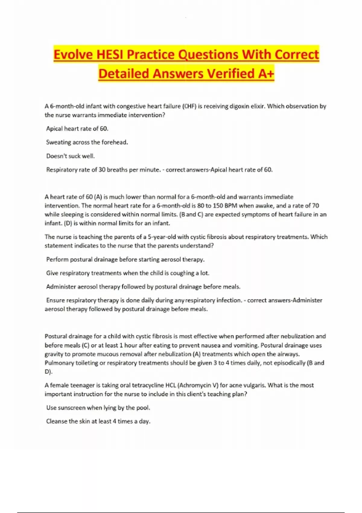 Evolve HESI Practice Questions With Correct Detailed Answers Verified A+ A 6-month-old infant with congestive heart failure (CHF) is receiving digoxin elixir. Which observation by the nurse warrants immediate intervention? Apical heart rate of 60. Sweating across the forehead. Doesn't suck well. Respiratory rate of 30 breaths per minute. - correct answers-Apical heart rate of 60. A heart rate of 60 (A) is much lower than normal for a 6-month-old and warrants immediate intervention. The normal heart rate for a 6-month-old is 80 to 150 BPM when awake, and a rate of 70 while sleeping is considered within normal limits. (B and C) are expected symptoms of heart failure in an infant. (D) is within normal limits for an infant. The nurse is teaching the parents of a 5-year-old with cystic fibrosis about respiratory treatments. Which statement indicates to the nurse that the parents understand? Perform postural drainage before starting aerosol therapy. Give respiratory treatments when the child is coughing a lot. Administer aerosol therapy followed by postural drainage before meals. Ensure respiratory therapy is done daily during any respiratory infection. - correct answers-Administer aerosol therapy followed by postural drainage before meals. Postural drainage for a child with cystic fibrosis is most effective when performed after nebulization and before meals (C) or at least 1 hour after eating to prevent nausea and vomiting. Postural drainage uses gravity to promote mucous removal after nebulization (A) treatments which open the airways. Pulmonary toileting or respiratory treatments should be given 3 to 4 times daily, not episodically (B and D). A female teenager is taking oral tetracycline HCL (Achromycin V) for acne vulgaris. What is the most important instruction for the nurse to include in this client's teaching plan? Use sunscreen when lying by the pool. Cleanse the skin at least 4 times a day.