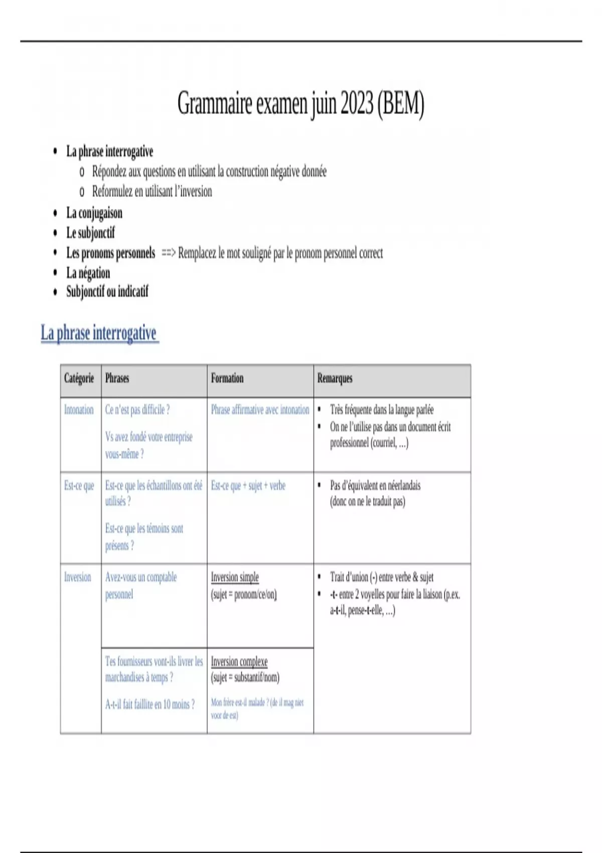 Grammaire examen juin 2023 (BEM)
