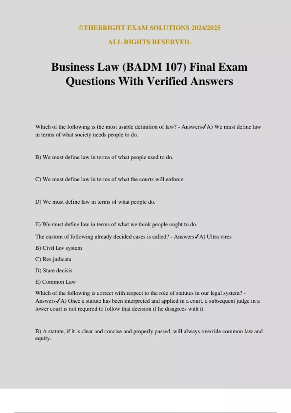 Which of the following is the most usable definition of law? - Answers✔A) We must define law