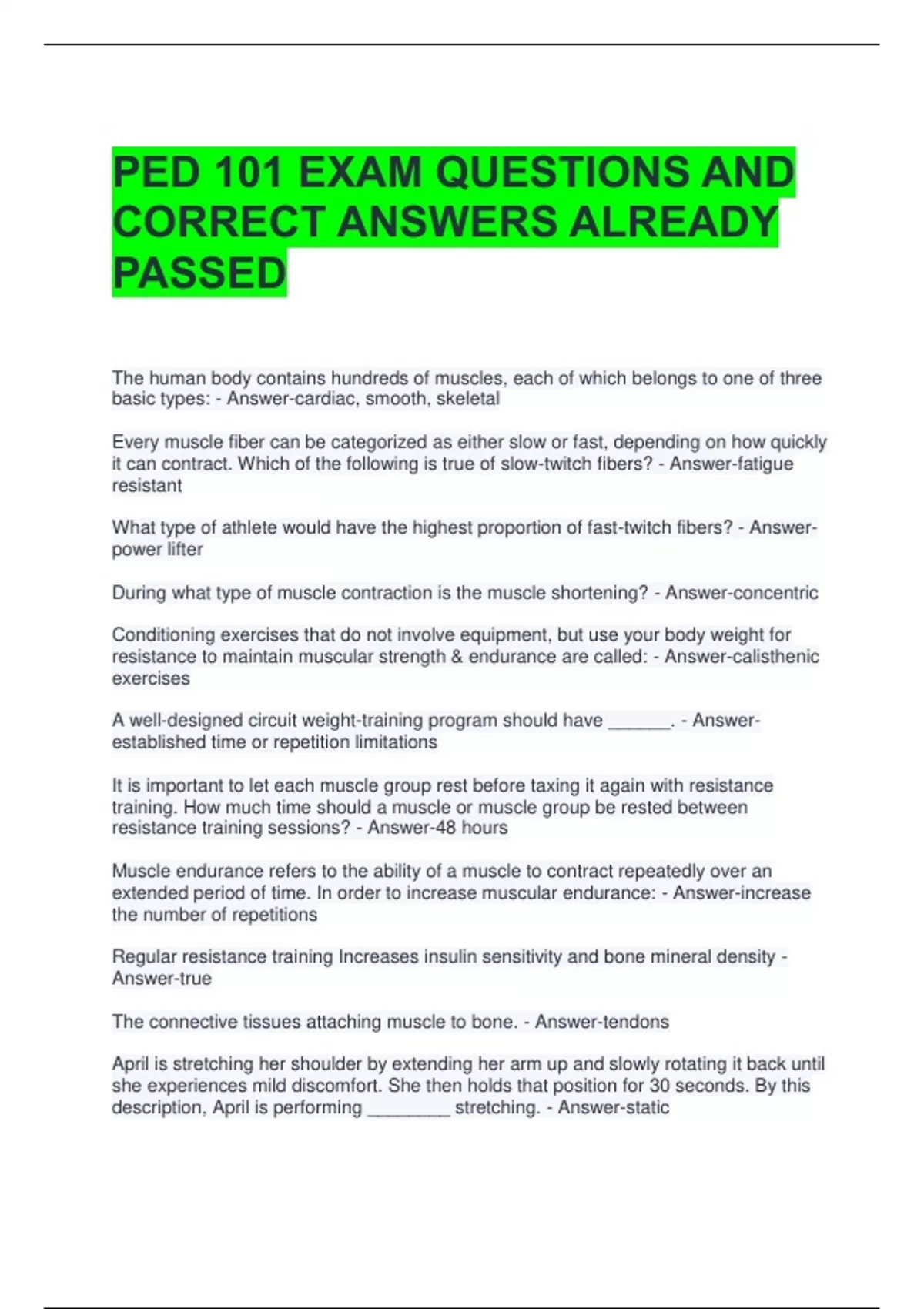 PED 101 EXAM QUESTIONS AND CORRECT ANSWERS ALREADY PASSED The human body contains hundreds of muscles, each of which belongs to one of three basic types: - Answer-cardiac, smooth, skeletal Every muscle fiber can be categorized as either slow or fast, depending on how quickly it can contract. Which of the following is true of slow-twitch fibers? - Answer-fatigue resistant What type of athlete would have the highest proportion of fast-twitch fibers? - Answer-power lifter During what type of muscle contraction is the muscle shortening? - Answer-concentric Conditioning exercises that do not involve equipment, but use your body weight for resistance to maintain muscular strength & endurance are called: - Answer-calisthenic exercises A well-designed circuit weight-training program should have ______. - Answer-established time or repetition limitations It is important to let each muscle group rest before taxing it again with resistance training. How much time should a muscle or muscle group be rested between resistance training sessions? - Answer-48 hours Muscle endurance refers to the ability of a muscle to contract repeatedly over an extended period of time. In order to increase muscular endurance: - Answer-increase the number of repetitions Regular resistance training Increases insulin sensitivity and bone mineral density - Answer-true The connective tissues attaching muscle to bone. - Answer-tendons April is stretching her shoulder by extending her arm up and slowly rotating it back until she experiences mild discomfort. She then holds that position for 30 seconds. By this description, April is performing ________ stretching. - Answer-static