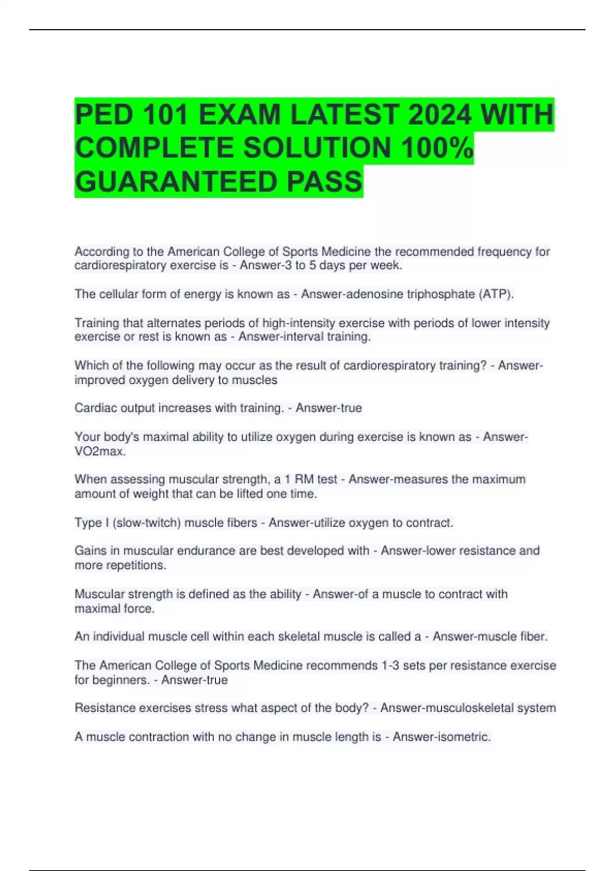 PED 101 EXAM LATEST 2024 WITH COMPLETE SOLUTION 100% GUARANTEED PASS According to the American College of Sports Medicine the recommended frequency for cardiorespiratory exercise is - Answer-3 to 5 days per week. The cellular form of energy is known as - Answer-adenosine triphosphate (ATP). Training that alternates periods of high-intensity exercise with periods of lower intensity exercise or rest is known as - Answer-interval training. Which of the following may occur as the result of cardiorespiratory training? - Answer-improved oxygen delivery to muscles Cardiac output increases with training. - Answer-true Your body's maximal ability to utilize oxygen during exercise is known as - Answer-VO2max. When assessing muscular strength, a 1 RM test - Answer-measures the maximum amount of weight that can be lifted one time. Type I (slow-twitch) muscle fibers - Answer-utilize oxygen to contract. Gains in muscular endurance are best developed with - Answer-lower resistance and more repetitions. Muscular strength is defined as the ability - Answer-of a muscle to contract with maximal force. An individual muscle cell within each skeletal muscle is called a - Answer-muscle fiber. The American College of Sports Medicine recommends 1-3 sets per resistance exercise for beginners. - Answer-true Resistance exercises stress what aspect of the body? - Answer-musculoskeletal system A muscle contraction with no change in muscle length is - Answer-isometric.