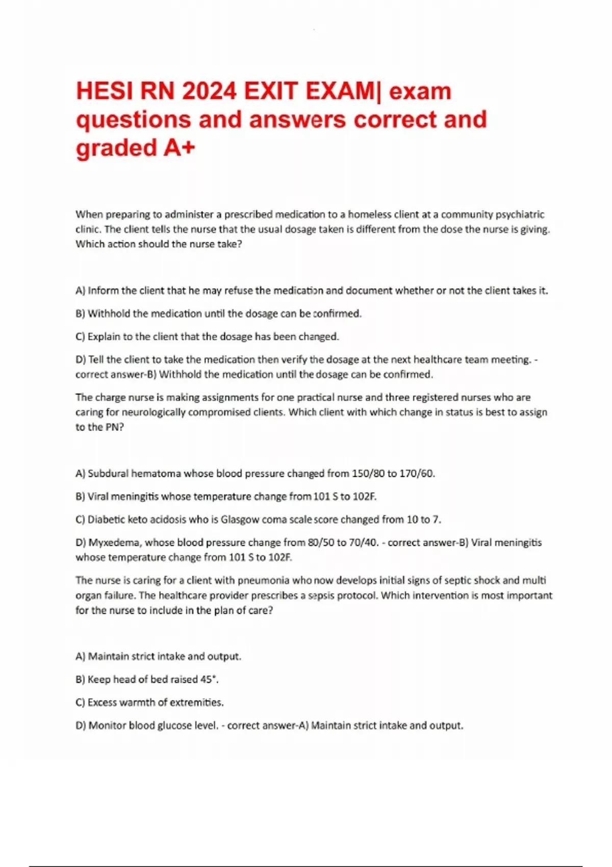 HESI RN 2024 EXIT EXAM| exam questions and answers correct and graded A+HESI RN 2024 EXIT EXAM| exam questions and answers correct and graded A+ When preparing to administer a prescribed medication to a homeless client at a community psychiatric clinic. The client tells the nurse that the usual dosage taken is different from the dose the nurse is giving. Which action should the nurse take? A) Inform the client that he may refuse the medication and document whether or not the client takes it. B) Withhold the medication until the dosage can be confirmed. C) Explain to the client that the dosage has been changed. D) Tell the client to take the medication then verify the dosage at the next healthcare team meeting. - correct answer-B) Withhold the medication until the dosage can be confirmed. The charge nurse is making assignments for one practical nurse and three registered nurses who are caring for neurologically compromised clients. Which client with which change in status is best to assign to the PN? A) Subdural hematoma whose blood pressure changed from 150/80 to 170/60. B) Viral meningitis whose temperature change from 101 S to 102F. C) Diabetic keto acidosis who is Glasgow coma scale score changed from 10 to 7. D) Myxedema, whose blood pressure change from 80/50 to 70/40. - correct answer-B) Viral meningitis whose temperature change from 101 S to 102F. The nurse is caring for a client with pneumonia who now develops initial signs of septic shock and multi organ failure. The healthcare provider prescribes a sepsis protocol. Which intervention is most important for the nurse to include in the plan of care? A) Maintain strict intake and output. B) Keep head of bed raised 45°. C) Excess warmth of extremities. D) Monitor blood glucose level. - correct answer-A) Maintain strict intake and output. And adolescent client is admitted to the hospital because of writing a suicide note to a teacher at school. On the second day of hospitalization, the nurse asked the client to meet with the treatment team. After the team meeting, the client leaves in tears and goes to their room. Which nursing intervention is best? A) Let the client rest quietly in their room for a while. B) Explore the clients goals and desire for treatment. C) Ask the treatment team about the clients behavior. D) Go to the clients room and ask what happened. - correct answer-D) Go to the clients room and ask what happened. The healthcare provider prescribes dalteparin 200 units per kilogram subcutaneous once a day for a client who weighs 154 pounds. The medication is available and 25,000 units per milliliter vial. How many milliliters should the nurse administer? (Enter numerical value only. If rounding is required, round to the nearest 10th.) - correct answer-0.6 NGN: The client is a 49-year-old male who reports flu like symptoms including fever and chest congestion for four days. He came to the emergency department last night when he was having more difficulty breathing he has a history of 1/2 pack a day cigarette smoking for 20 years. He has no significant medical or surgical history. Which two orders should the nurse complete first? A) Sputum culture. B) Start oxygen 3 L per minute via nasal cannula. C) Place the client on a cardio respiratory monitor. D) Chest x-ray. E) Acetominophen 350 mg PO every six hours for temperature control. F) Run 0.9% sodium chloride IV infusion at 150 mL per hour. G) Start peripheral IV. H) NPO. - correct answer-B) Start oxygen 3 L per minute via nasal cannula. C) Place the client on a cardio respiratory monitor. NGN: 0330: place the client on a cardio respiratory monitor, NPO, sputum culture, start a peripheral IV infusion, start oxygen 3 L per minute via nasal cannula, begin 0.9% sodium chloride IV infusion at 150 mL per hour, acetaminophen 350 mg PO every six hours for temperature. To start the client on oxygen as ordered which items should the nurse collects from the supply room? SATA A) humidifier bottle. B)Suction canister. C)Sterile water. D) Nasal cannula. E) Flow meter. F) Lambs wool. G) Tape. - correct answer-D) Nasal cannula. E) Flow meter. NGN: states, I am feeling extremely anxious right now. The client has decreased breath sounds in the left lower low. His mucus membranes are dry. He has a productive cough with thick, yellow secretions. His capillary refill is four seconds. Vital signs, temperature 100.2. Heart rate 101 bpm, respiratory rate 28 breaths per minute, blood pressure 145/89, oxygen saturation 90% on room air. (for each body system click to specify the assessment findings that indicates hypoxia) Cardiovascular: heart rate 100 bpm, capillary refill for seconds, blood pressure 145/89. Neurological: anxious, awake and alert, restless. Respiratory: oxygen saturation 90% on room air, respiratory rate 28 bpm, productive cough. - correct answer-Cardiovascular: capillary refill for seconds, blood pressure 145/89. Neurological: anxious, restless. Respiratory: oxygen saturation 90% on room air, respiratory rate 28 bpm. NGN: The client is a 49-year-old male who reports flu like symptoms including fever and chest congestion for four days. He came to the emergency department last night when he was having more difficulty breathing he has a history of 1/2 pack a day cigarette smoking for 20 years. He has no significant medical or surgical history. The nurse should place the client in a _______________ position to promote _____________. - correct answer-Semi-Fowler , lung expansion. NGN: Orders: 0330: place the client on a cardio respiratory monitor, NPO, sputum culture, start a PIV, start oxygen 3L via nasal cannula, normal saline 150 ML per hour, acetaminophen 350mg PO every six hours for temp greater than 101F, chest x-ray. 0500: Oxygen 8Lvia simple facemask, titrate to keep oxygen saturation greater than 94%. (mark whether the statements by the new grad nurse indicate understanding or no understanding of the use of facemask in the care of this client) -I should clean the facemask onc