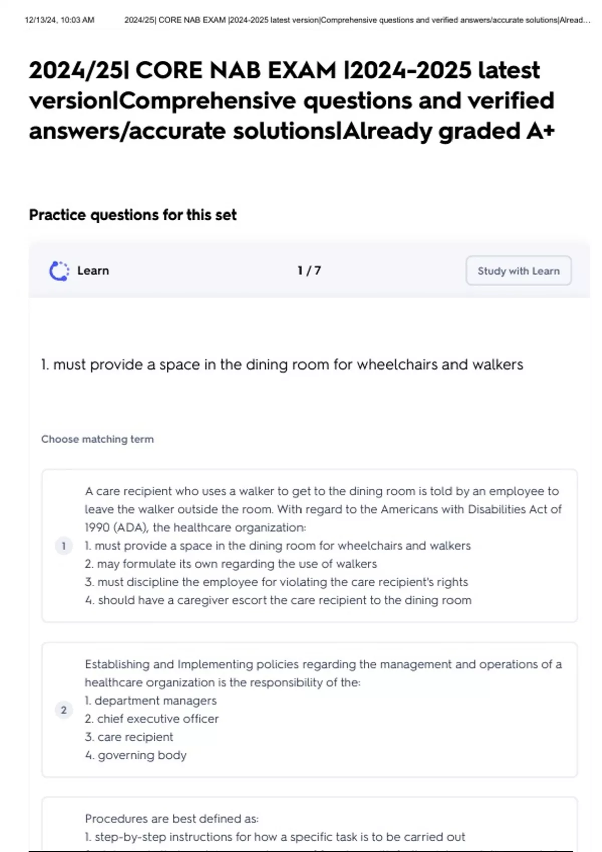 2024/25| CORE NAB EXAM | latest version|Comprehensive questions and verified answers/accurate solutions|Already graded A+ Practice questions for this set Learn 1 / 7 Study with Learn 1. must provide a space in the dining room for wheelchairs and walkers Choose matching term 1 A care recipient who uses a walker to get to the dining room is told by an employee to leave the walker outside the room. With regard to the Americans with Disabilities Act of 1990 (ADA), the healthcare organization: 1. must provide a space in the dining room for wheelchairs and walkers 2. may formulate its own regarding the use of walkers 3. must discipline the employee for violating the care recipient's rights 4. should have a caregiver escort the care recipient to the dining room 2 Establishing and Implementing policies regarding the management and operations of a healthcare organization is the responsibility of the: 1. department managers 2. chief executive officer 3. care recipient 4. governing body 3 Procedures are best defined as: 1. step-by-step instructions for how a specific task is to be carried out 2. statements that contain some degree of freedom with further interpretation needed 3. operational statements that are handed down from the governing body to the administrator 4. statements that are governed by the caregiver council 12/13/24, 10:03 AM 2024/25| CORE NAB EXAM | latest version|Comprehensive questions and verified answers/accurate solutions|Alread… Terms in this set (185) When a family is being interviewed regarding a provision of services, the first course of action should be to: - 1. discuss the healthcare organization's rate structure 2. inquire about the potential care recipient's needs 3. give tour of the healthcare organization 4. talk about the healthcare organization's strengths compared to the competition's 2. inquire about the potential care recipient's needs When marketing a healthcare organization, the market is considered to be all of the individuals: 1. living within an established radius of the healthcare organization 2. enrolled in the Medicaid or Medicare programs 3. with a demand for their service of product 4. discharging from an acute care hospital 3. with a demand for their service of product 4 When the actual supply cost substantially exceeds the expected cost, the administrator should initially: 1. tightly control products 2. investigate probable breach of security 3. review production schedules 4. examine methods of inventory Don't know? 12/13/24, 10:03 AM 2024/25| CORE NAB EXAM | latest version|Comprehensive questions and verified answers/accurate solutions|Alread… Ethics are the beliefs or attitudes that make up which kind of organizational values? 1. Humanitarian 2. Religious 3. Moral 4. Civic 3. Moral A cognitive care recipient, whose spouse is living, does not have an advance directive or a Do Not Resuscitate (DNR) order. The care recipient's daughter has financial Power of Attorney, and the son has Healthcare of Power of Attorney. A DNR order can be authorized by the: 1. care recipient's son 2. care recipient 3. care recipient's spouse 4. physician 1. care recipient's son Establishing and Implementing policies regarding the management and operations of a healthcare organization is the responsibility of the: 1. department managers 2. chief executive officer 3. care recipient 4. governing body 2. chief executive officer All employees in a healthcare organization should be working toward the organization's purpose, which described in the healthcare organization's: 1. articles of incorporation 2. governance body 3. organization charts 4. mission statement 4. mission statement 12/13/24, 10:03 AM 2024/25| CORE NAB EXAM | latest version|Comprehensive questions and verified answers/accurate solutions|Alread… PRN means: 1. administer as necessary 2. pain reducing narcotics 3. dispense at bedtime 4. care recipient refusal and noted 1. administer as necessary Changing a bathing schedule to meet the care recipient's time preference is an example of: 1. permanent assignment 2. person-centered care 3. green living 4. time management 2. person-centered care Mrs. J has completed a Do Not Resuscitate (DNR) form. A friend of hers comes to the office, upset that Mrs. J has chosen to have a DNR, and asks for a copy of the DNR to discuss it with Mrs. J. The staff should: 1. not release the DNR because it cannot be changed once it has been signed 2. call Mrs. J's physician to release the form to the visitor 3. release the form so the friend can help Mrs. J understand the DNR 4. not release the form because of confidentiality 4. not release the form because of confidentiality 12/13/24, 10:03 AM 2024/25| CORE NAB EXAM | latest version|Comprehensive questions and verified answers/accurate solutions|Alread… Care recipients who elect to receive hospice benefits should receive: 1. pain relief and symptom management 2. notice that their stay can continue for a maximum of six months 3. additional life-sustaining services that are covered by Medicare 4. priority admission to an acute-care hospital 3. additional life-sustaining services that are covered by Medicare One of the most commonly diagnosed mental illnesses in the elderly is: 1. depression 2. obsessive-compulsive disorder 3. schizophrenia 4. paranoia 1. Depression