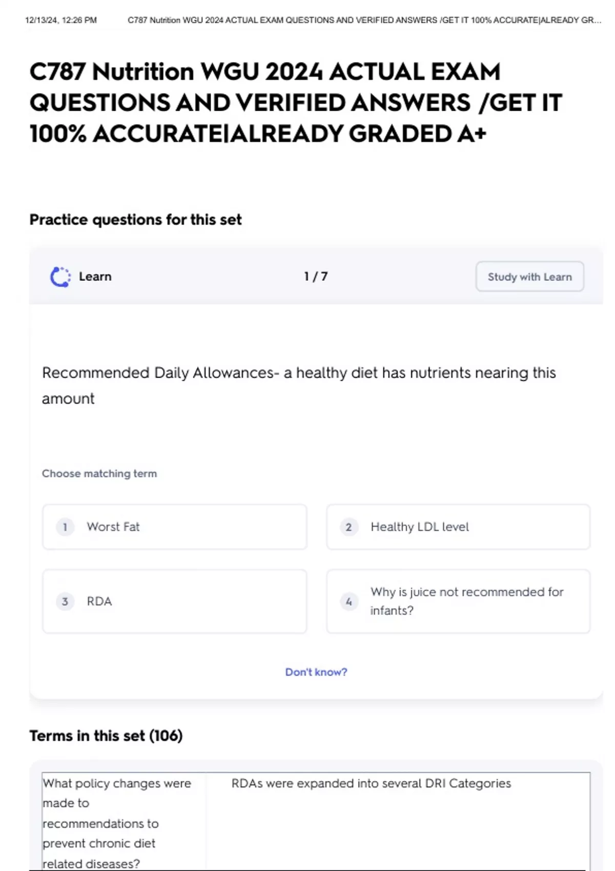 , 12/13/24, 12:26 PM C787 Nutrition WGU 2024 ACTUAL EXAM QUESTIONS AND VERIFIED ANSWERS /GET IT 100% ACCURATE|ALREADY GR…
