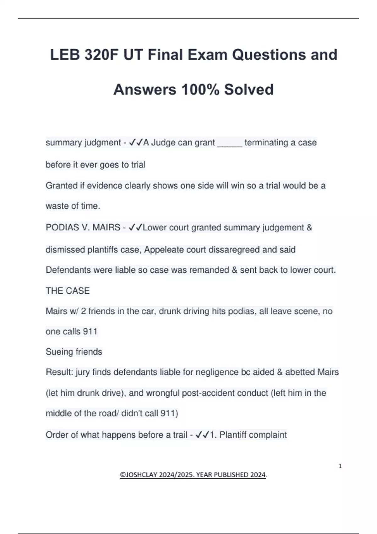 LEB 320F UT Final Exam Questions and Answers 100% Solved summary judgment - A Judge can grant _____ terminating a case before it ever goes to trial Granted if evidence clearly shows one side will win so a trial would be a waste of time. PODIAS V. MAIRS - Lower court granted summary judgement & dismissed plantiffs case, Appeleate court dissaregreed and said Defendants were liable so case was remanded & sent back to lower court. THE CASE Mairs w/ 2 friends in the car, drunk driving hits podias, all leave scene, no one calls 911 Sueing friends Result: jury finds defendants liable for negligence bc aided & abetted Mairs (let him drunk drive), and wrongful post-accident conduct (left him in the middle of the road/ didn't call 911) Order of what happens before a trail - 1. Plantiff complaint