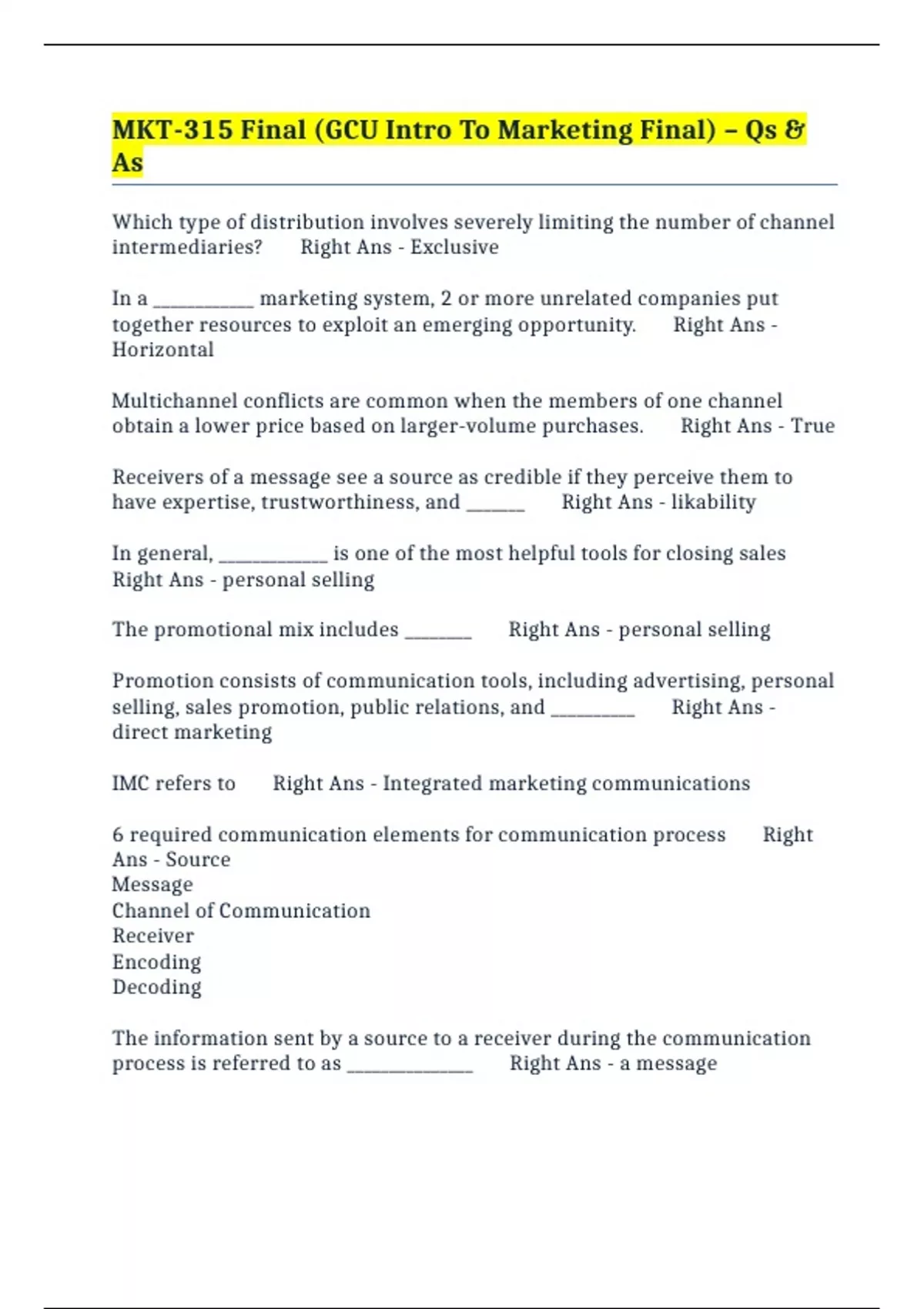 MKT-315 Final (GCU Intro To Marketing Final) – Qs &