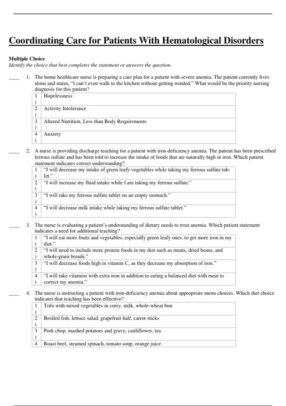Coordinating Care for Patients With Hematological Disorders Multiple Choice Identify the choice that best completes the statement or answers the question. ____ 1. The home healthcare nurse is preparing a care plan for a patient with severe anemia. The patient currently lives alone and states, “I can’t even walk to the kitchen without getting winded.” What would be the priority nursing diagnosis for this patient? 1 ) Hopelessness 2 ) Activity Intolerance 3 ) Altered Nutrition, Less than Body Requirements 4 ) Anxiety ____ 2. A nurse is providing discharge teaching for a patient with iron-deficiency anemia. The patient has been prescribed ferrous sulfate and has been told to increase the intake of foods that are naturally high in iron. Which patient statement indicates correct understanding? 1 ) “I will decrease my intake of green leafy vegetables while taking my ferrous sulfate tablet.” 2 ) “I will increase my fluid intake while I am taking my ferrous sulfate.” 3 ) “I will take my ferrous sulfate tablet on an empty stomach.” 4 ) “I will decrease milk intake while taking my ferrous sulfate tablet.” ____ 3. The nurse is evaluating a patient’s understanding of dietary needs to treat anemia. Which patient statement indicates a need for additional teaching? 1 ) “I will eat more fruits and vegetables, especially green leafy ones, to get more iron in my diet.” 2 ) “I will need to include more protein foods in my diet such as meats, dried beans, and whole-grain breads.” 3 ) “I will decrease foods high in vitamin C, as they decrease my absorption of iron.” 4 ) “I will take vitamins with extra iron in addition to eating a balanced diet with meat to correct my anemia.” ____ 4. The nurse is instructing a patient with iron-deficiency anemia about appropriate menu choices. Which diet choice indicates that teaching has been effective? 1 ) Tofu with mixed vegetables in curry, milk, whole-wheat bun 2 ) Broiled fish, lettuce salad, grapefruit half, carrot sticks 3 ) Pork chop, mashed potatoes and gravy, cauliflower, tea 4 Roast beef, steamed spinach, tomato soup, orange juice ) ____ 5. A nurse is providing discharge instructions to a patient with iron-deficiency anemia who is experiencing glossitis. Which patient statement indicates the need for further education? 1 ) “I will monitor my lips and tongue daily.” 2 ) “I will use an alcohol-based mouthwash twice per day.” 3 ) “I will apply a petroleum-based lubricating ointment to my lips.” 4 ) “I will use a soft toothbrush when brushing my teeth each day.” ____ 6. The nurse is planning care for a patient with acute myeloid leukemia (AML). Which is the priority nursing diagnosis to minimize the risk of complications associated with AML? 1 ) Risk for Bleeding 2 ) Ineffective Thermoregulation 3 ) Imbalanced Nutrition 4 ) Fluid Volume Excess ____ 7. A pediatric patient being treated for acute lymphocytic leukemia (ALL) has a white blood cell count of 1,000/mm3. Which nursing diagnosis would be a priority for this patient? 1 ) Readiness for Enhanced Immunization Status 2 ) Impaired Gas Exchange 3 ) Risk for Infection 4 ) Activity Intolerance ____ 8. A pediatric nurse is caring for a child with acute lymphoblastic leukemia (ALL). When providing education to the child’s parents regarding this disease, which topic should the nurse include? 1 ) ALL is characterized by abnormal proliferation of all bone marrow elements. 2 ) This form of leukemia is the most common type among children and adolescents. 3 ) This form of leukemia is very rarely seen in children. 4 ) The onset of ALL is usually gradual.
